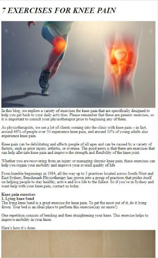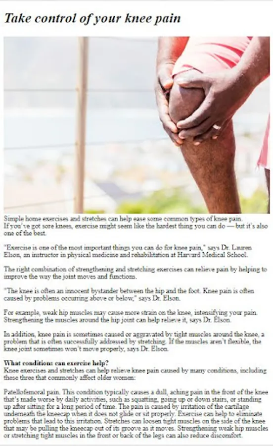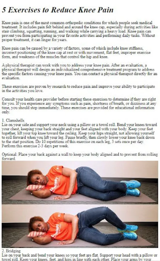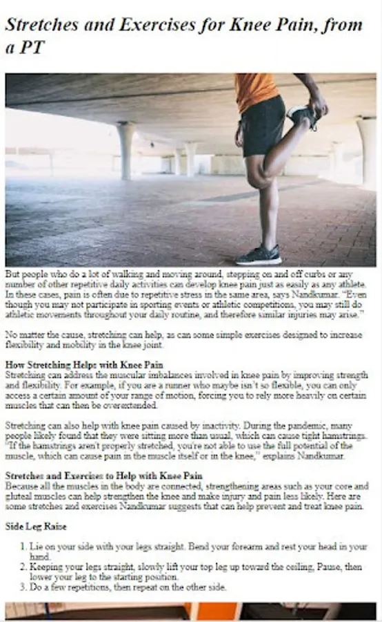 Ready to take control of your knee health and say goodbye to knee pain? Download "Exercises for Knee Pain Tips" now from Google Play. Our app provides a comprehensive collection of exercises, stretching routines, and personalized training plans tailored to your specific needs. Whether you're a beginner or an experienced individual seeking targeted workouts, you'll find everything you need to address your knee pain effectively.