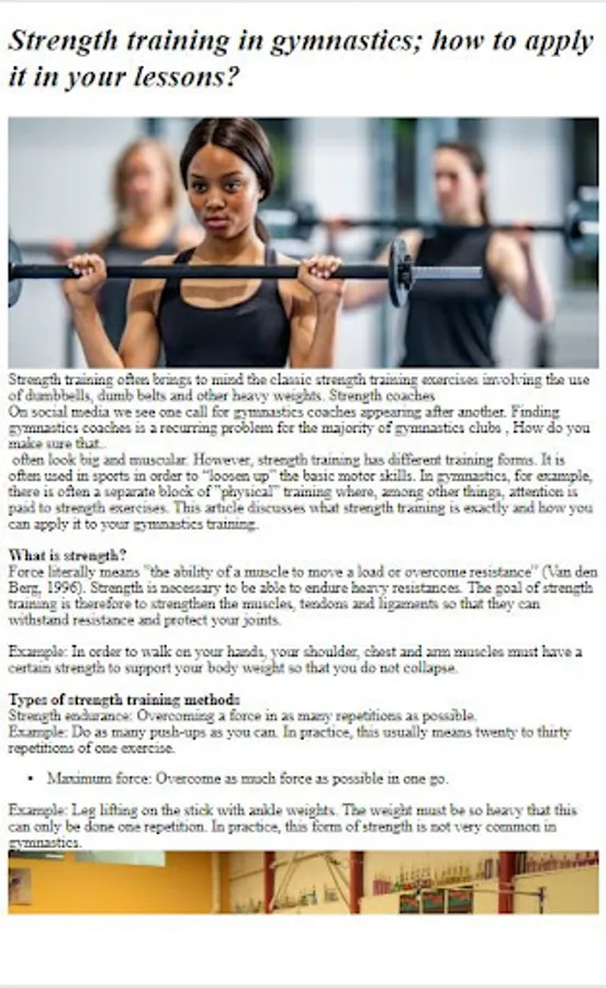 Whether you're training at home, in a gym, or on the go, our app provides a diverse range of exercises that can be performed with or without equipment. You'll find a variety of conditioning exercises to strengthen your core, upper body, lower body, and improve your overall flexibility. Additionally, we offer specialized drills to enhance your balance, coordination, and spatial awareness, crucial elements for success in gymnastics.