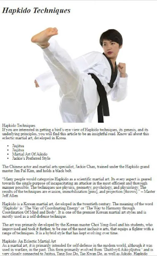 Hapkido is a versatile martial art that focuses on self-defense techniques, joint locks, throws, and strikes. With our app, you'll learn the fundamental principles of Hapkido, understand the correct body mechanics, and master the art of executing precise and effective techniques. Our step-by-step tutorials, accompanied by video demonstrations, ensure that you grasp the essence of Hapkido and perform each move with confidence and accuracy.