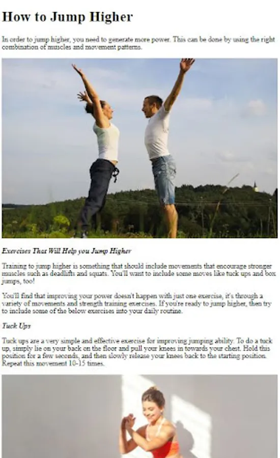 Welcome to "How to Do Jump Higher Training," your ultimate companion for increasing your vertical jump and taking your athletic performance to new heights. Whether you're a basketball player looking to improve your dunking skills, a volleyball player striving for powerful spikes, or an athlete seeking to enhance your overall explosiveness, our app provides expert guidance, targeted exercises, and specialized training programs to help you soar above the competition.