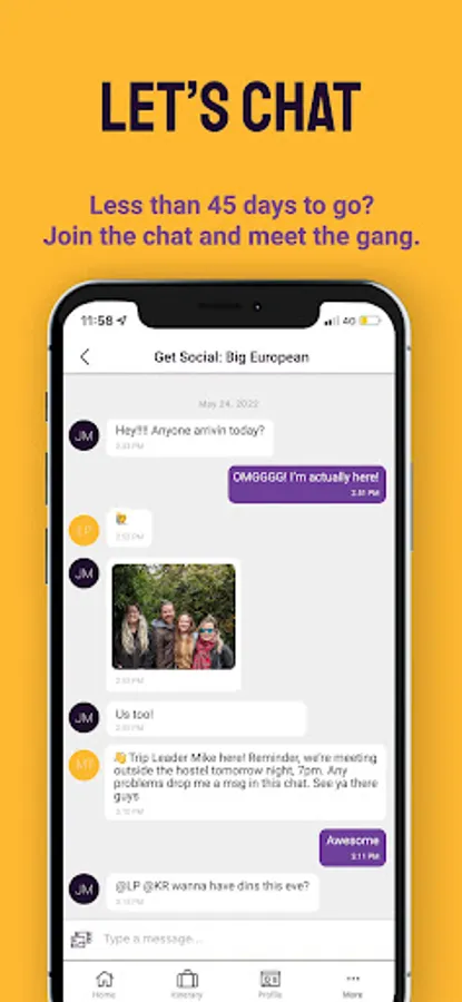 • GROUP CHAT. Less than 45 days to go? Enter the group chat and meet your fellow trip mates — soon to be friends for life.