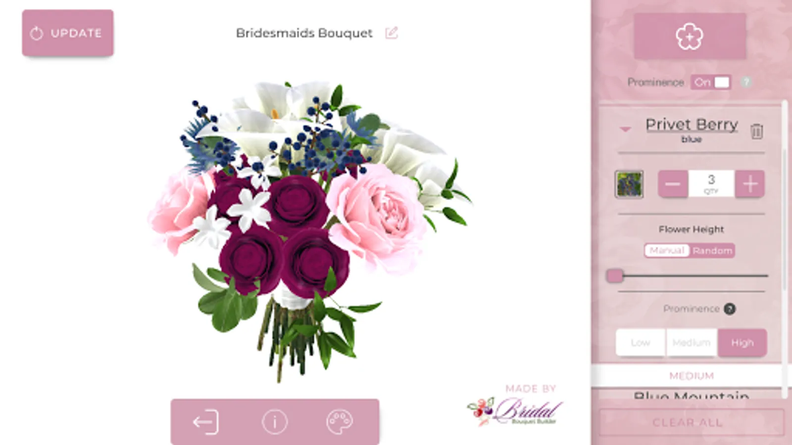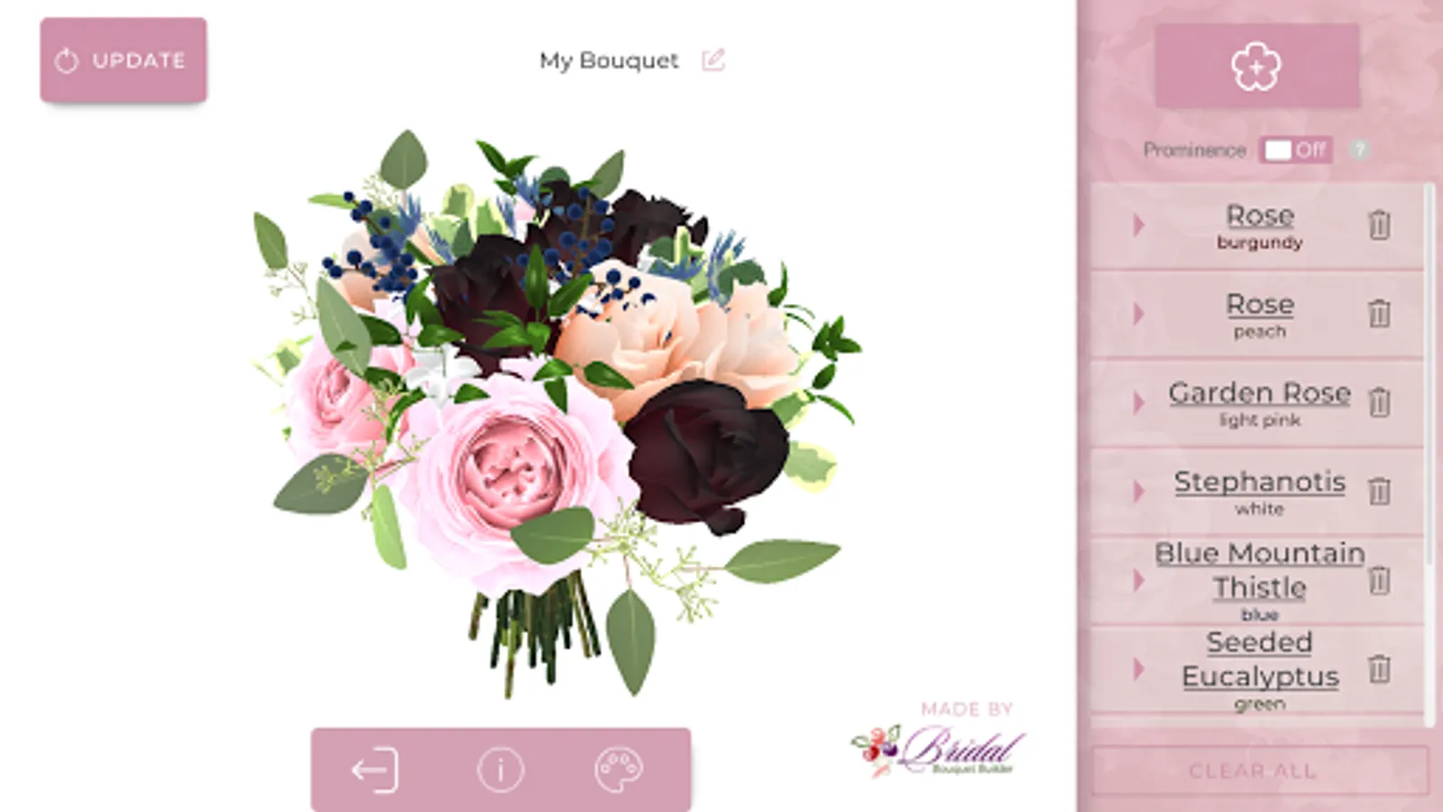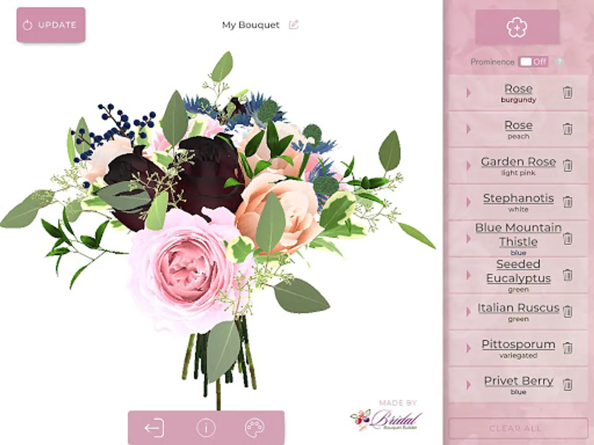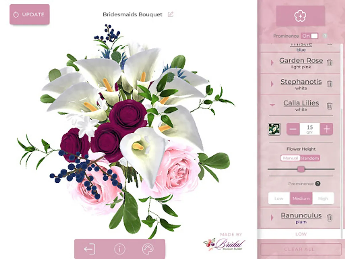 Start by choosing your dress color. Then, hop in the app and choose your flowers and foliage. Change the color or variety of flowers with a click and then generate a new bouquet by hitting the Update button. You will be able to rotate your bouquet, so you can see if from every angle.