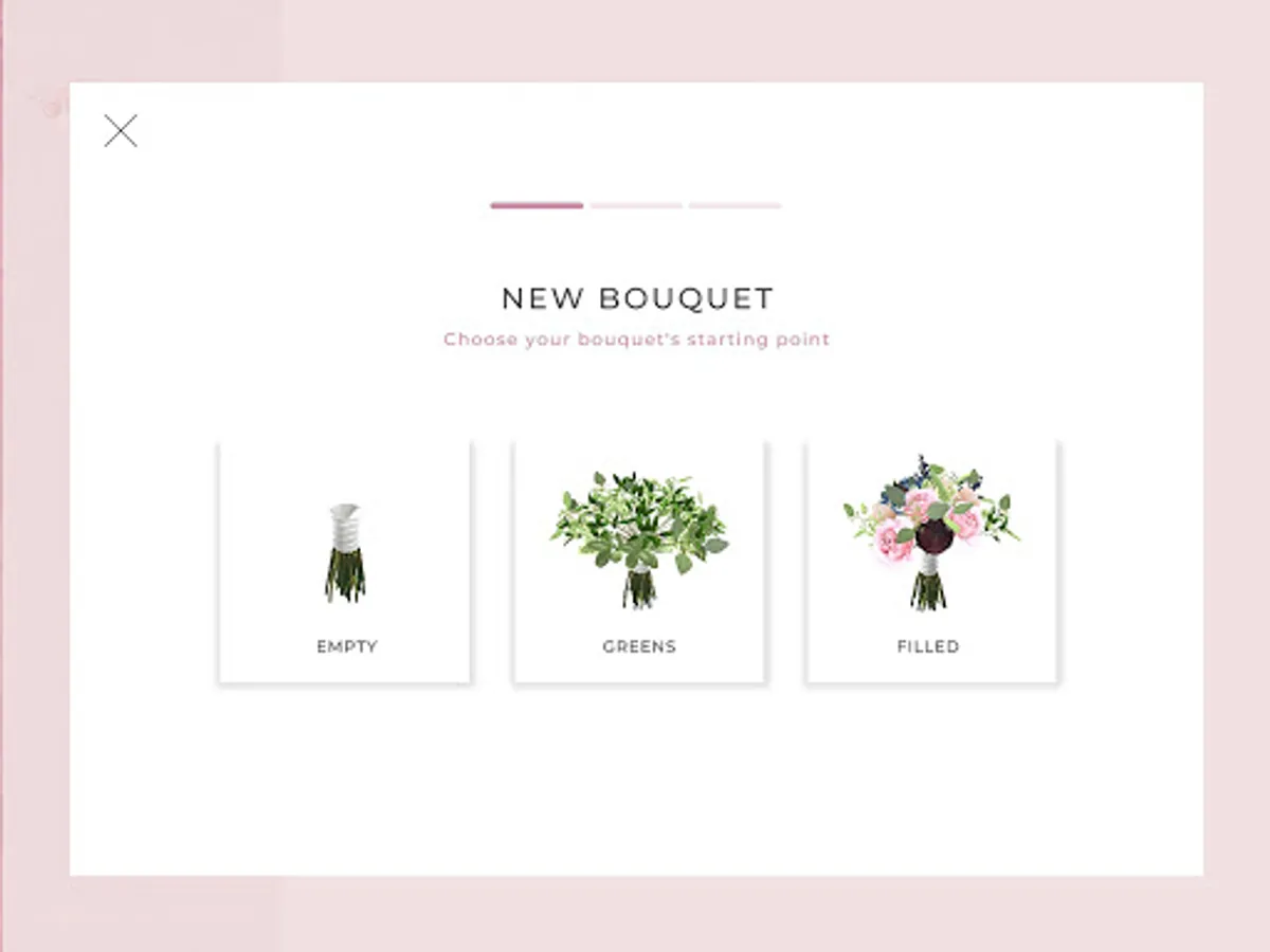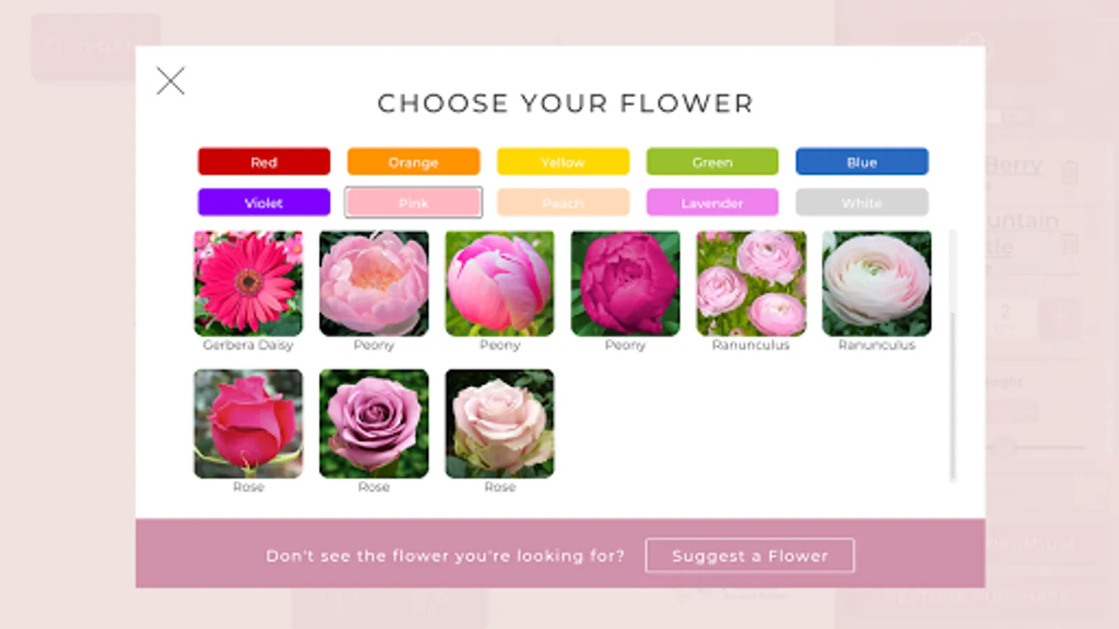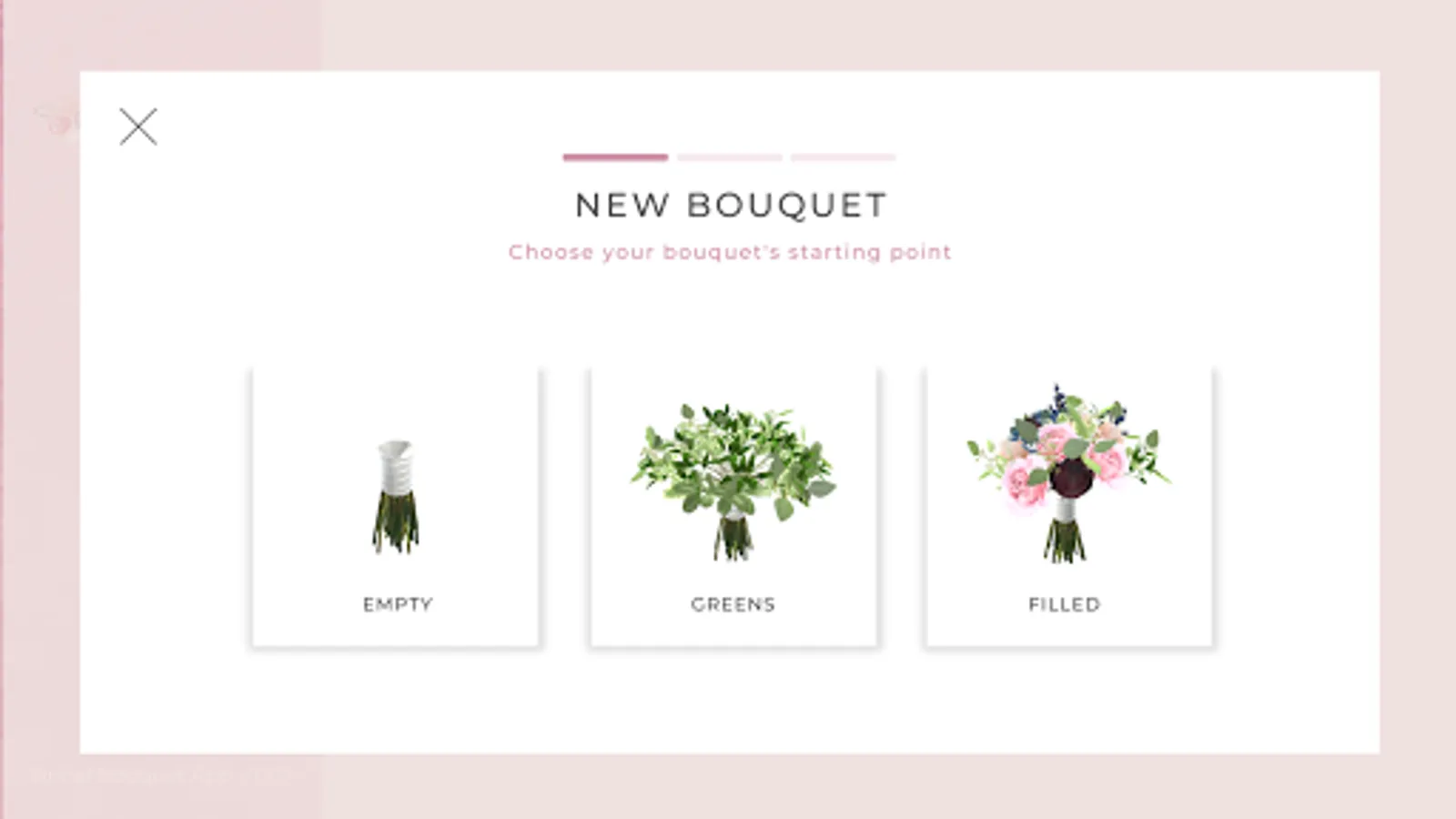 Start by choosing your dress color. Then, hop in the app and choose your flowers and foliage. Change the color or variety of flowers with a click and then generate a new bouquet by hitting the Update button. You will be able to rotate your bouquet, so you can see if from every angle.