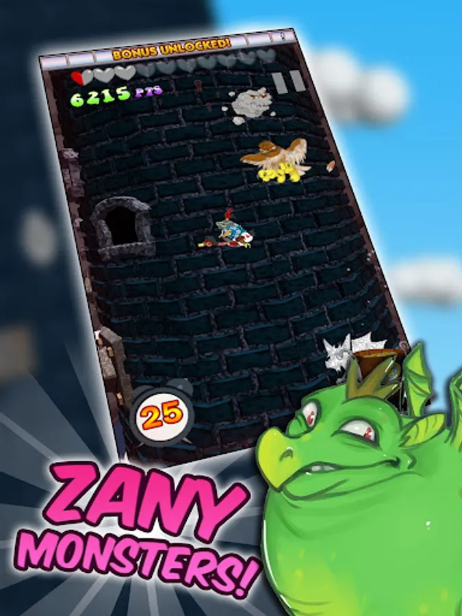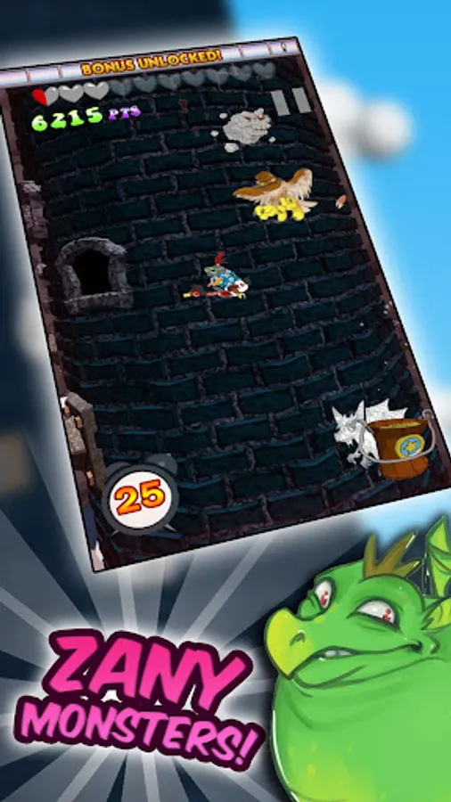 The mad wizard is at it again, sending all manner of fearsome, ugly and flatulent beasts down his tower to terrorise the villagers! Command Sir Steven, riding his valiant goose steed, James, and defeat as many of the evil creatures as you can!