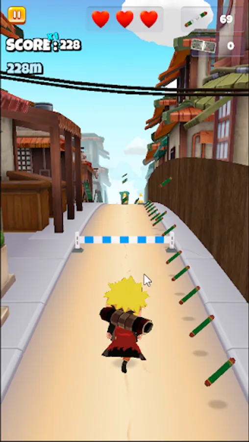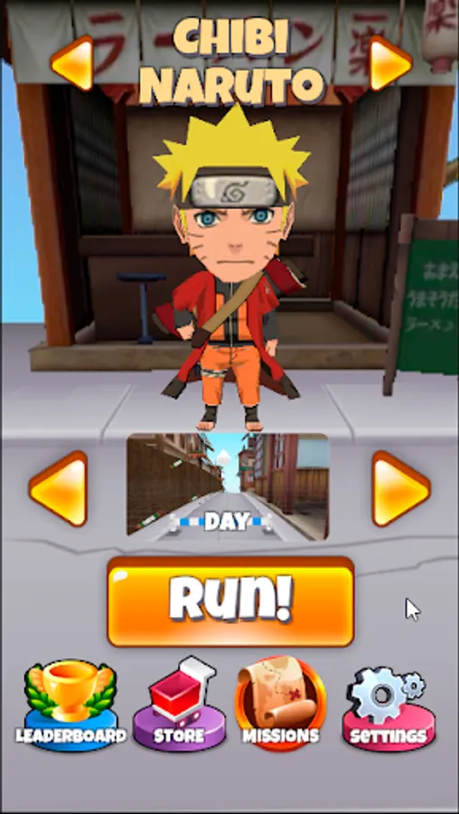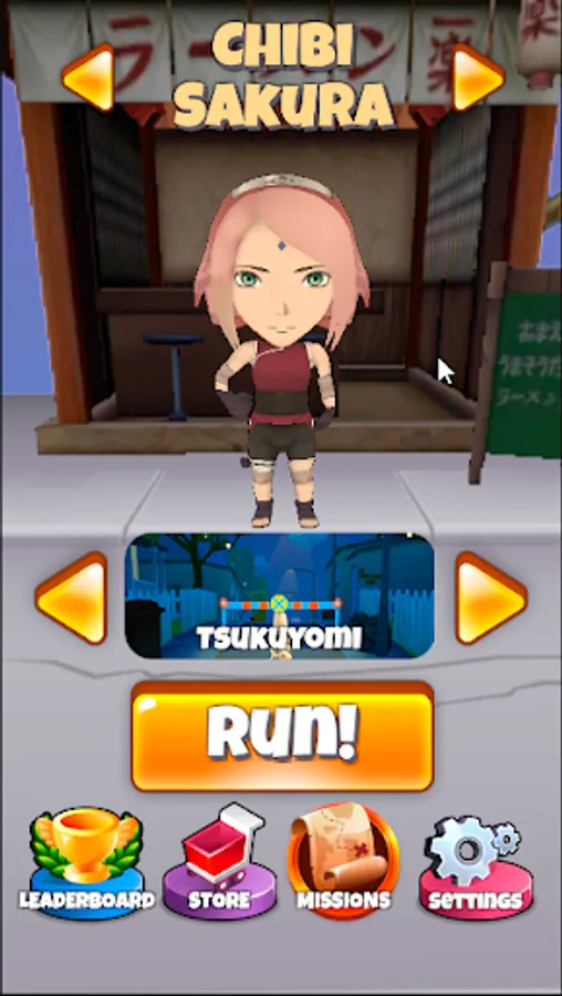 Run around Konoha, jump over obstacles, collect scrolls to unlock new characters, as well as the Tsukuyomi location.