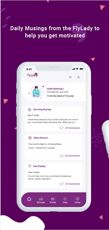 FlyLadyPlus breaks the home down into zones and gives you cleaning lists & a fun daily mission for 1 zone we focus on each week. Plus, daily Musings from the FlyLady to help you get motivated and ready each morning!