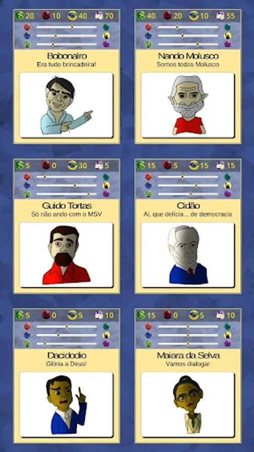 This game is freely inspired in real characters and facts and with no guarantee of reflecting reality, and was carried out without any party association and with the effort to maintain ideological neutrality.