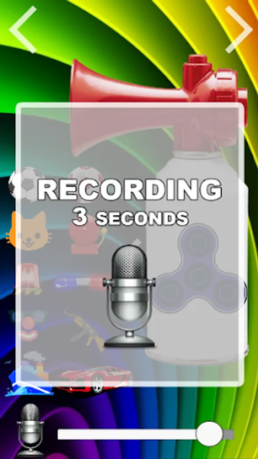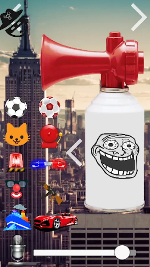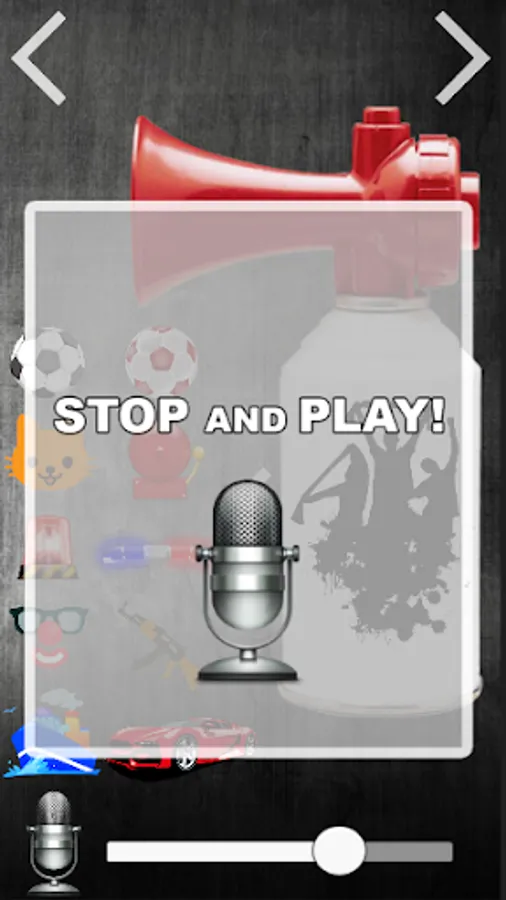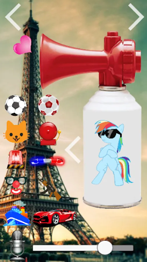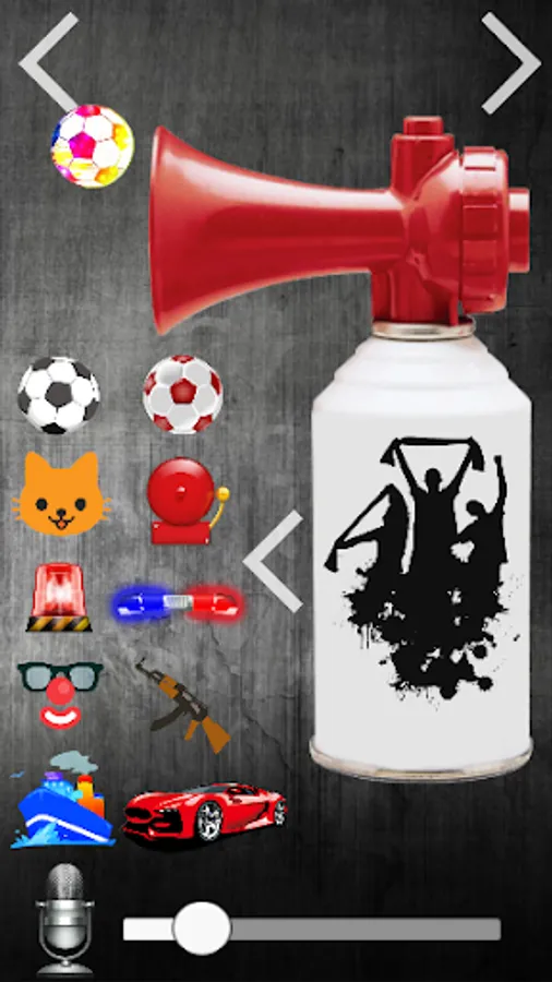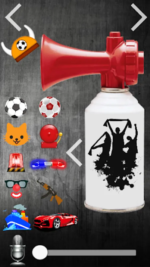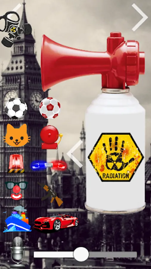 The Stadium Horn Sounds has the following tones: football sounds, cute cat, siren, police siren, bell ringing, clown, boat, machine, car engine. You can also record your own sound.