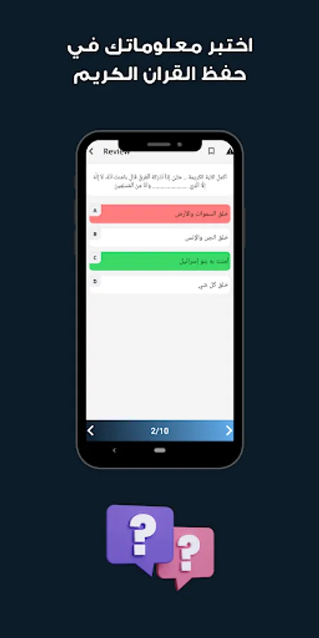 3- اختبار القران الكريم( Quran quiz questions and answers ) والذي يتضمن الكثير من الفئات المتنوعة مثل :اسئلة عن جزء عم ، اسئلة عن جزء تبارك واسئلة عن جزء قد سمع و ( Quran surah quiz )