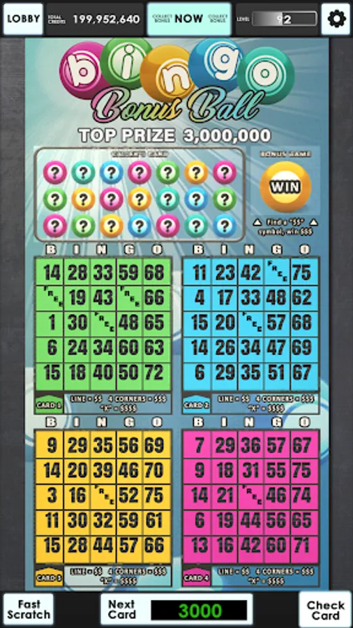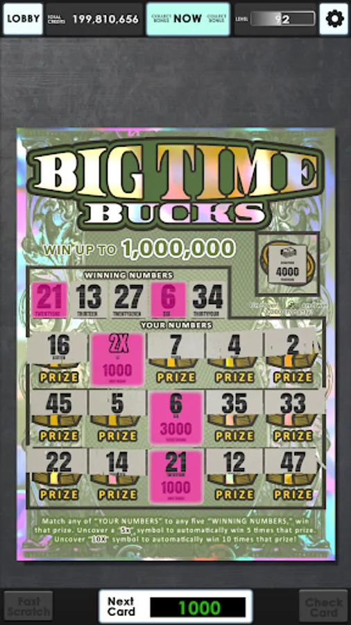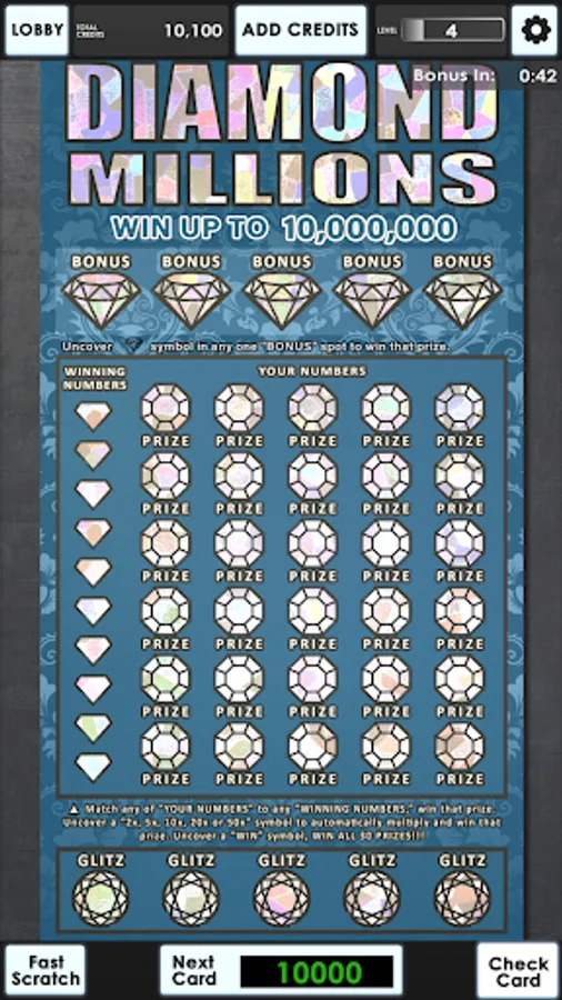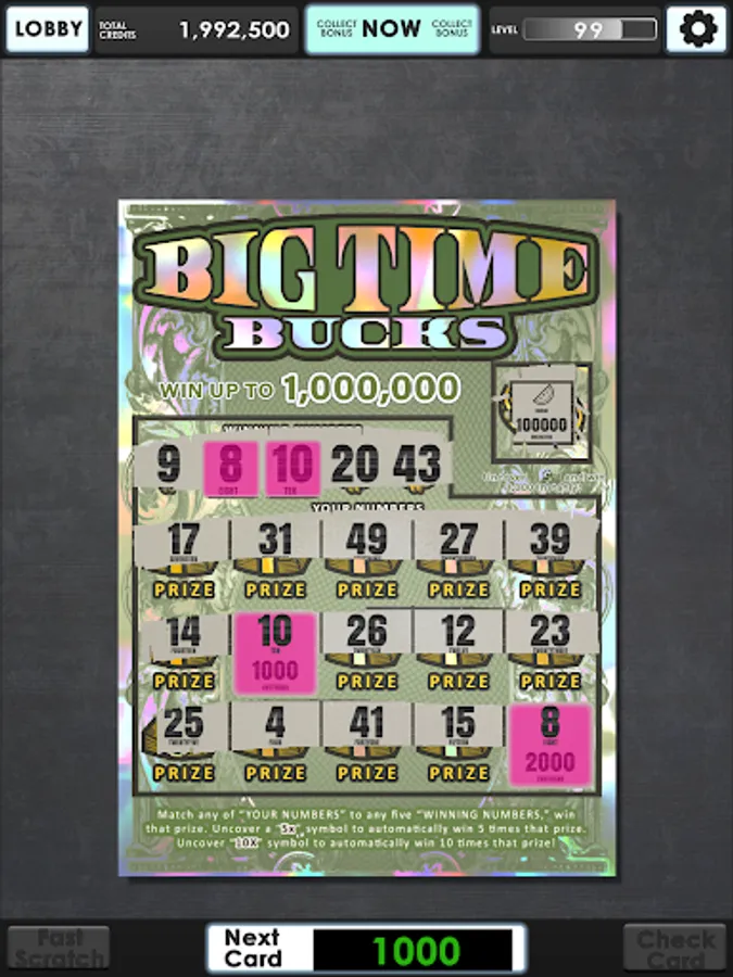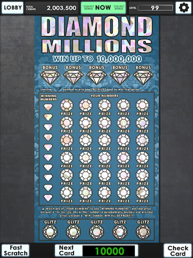 Use your finger to "scratch" card surface to match winning numbers to your numbers, or to reveal bonus multipliers.