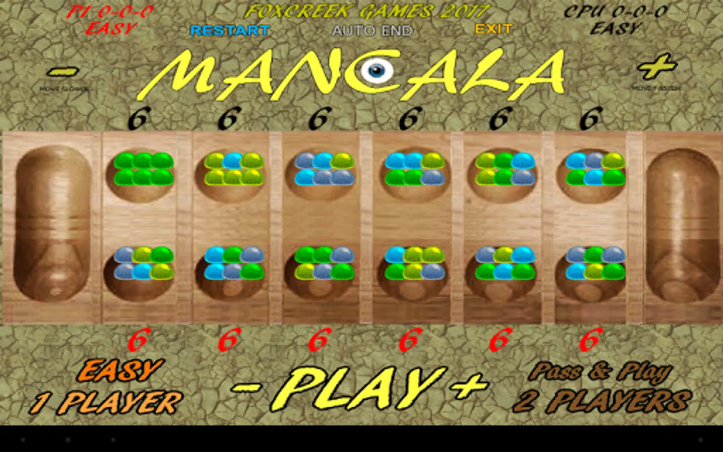 Game features 3 skill levels with player statistics tracked by skill for Wins-Losses-Ties. Default starting stones per cup is 4 but can be adjusted from 2 up to 9.