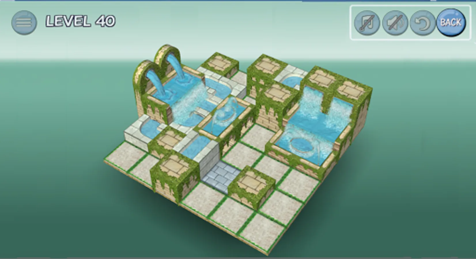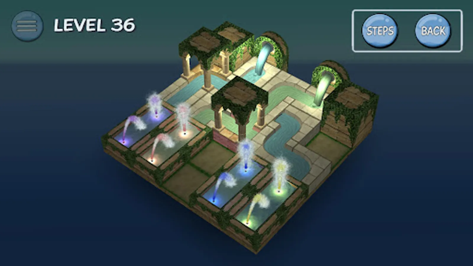 Train your mind, solve the different puzzles by making the water flow from its origin to the color fountains forming different waterfalls. Create water jets, water cascades, move the different blocks and stones, channels and pipes through the 3D board and get the water of each color to flow and find the way to your destination fountain.