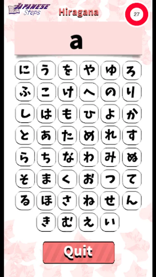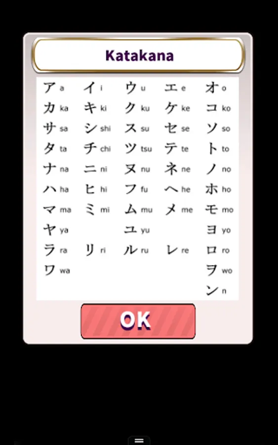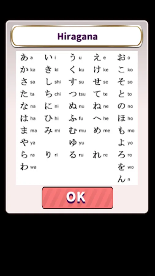 This application contains the Kana system of Japanese Alphabet. The basic hiragana and katakana.
