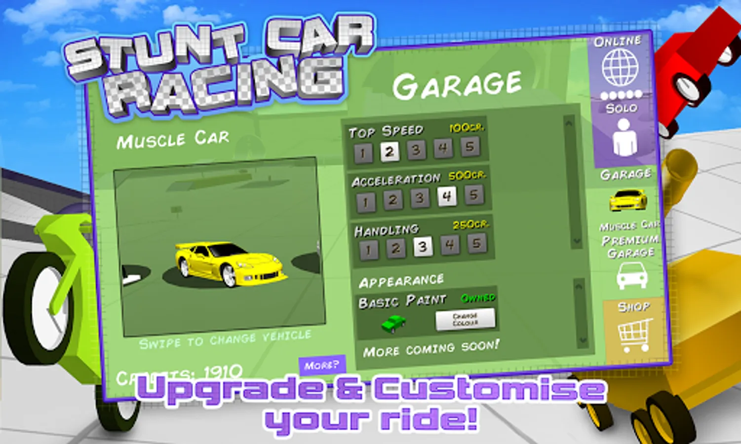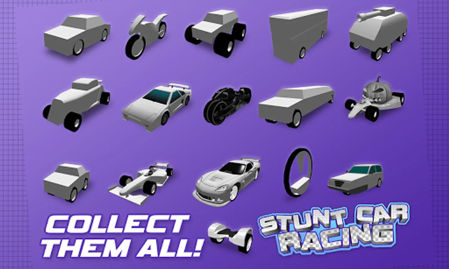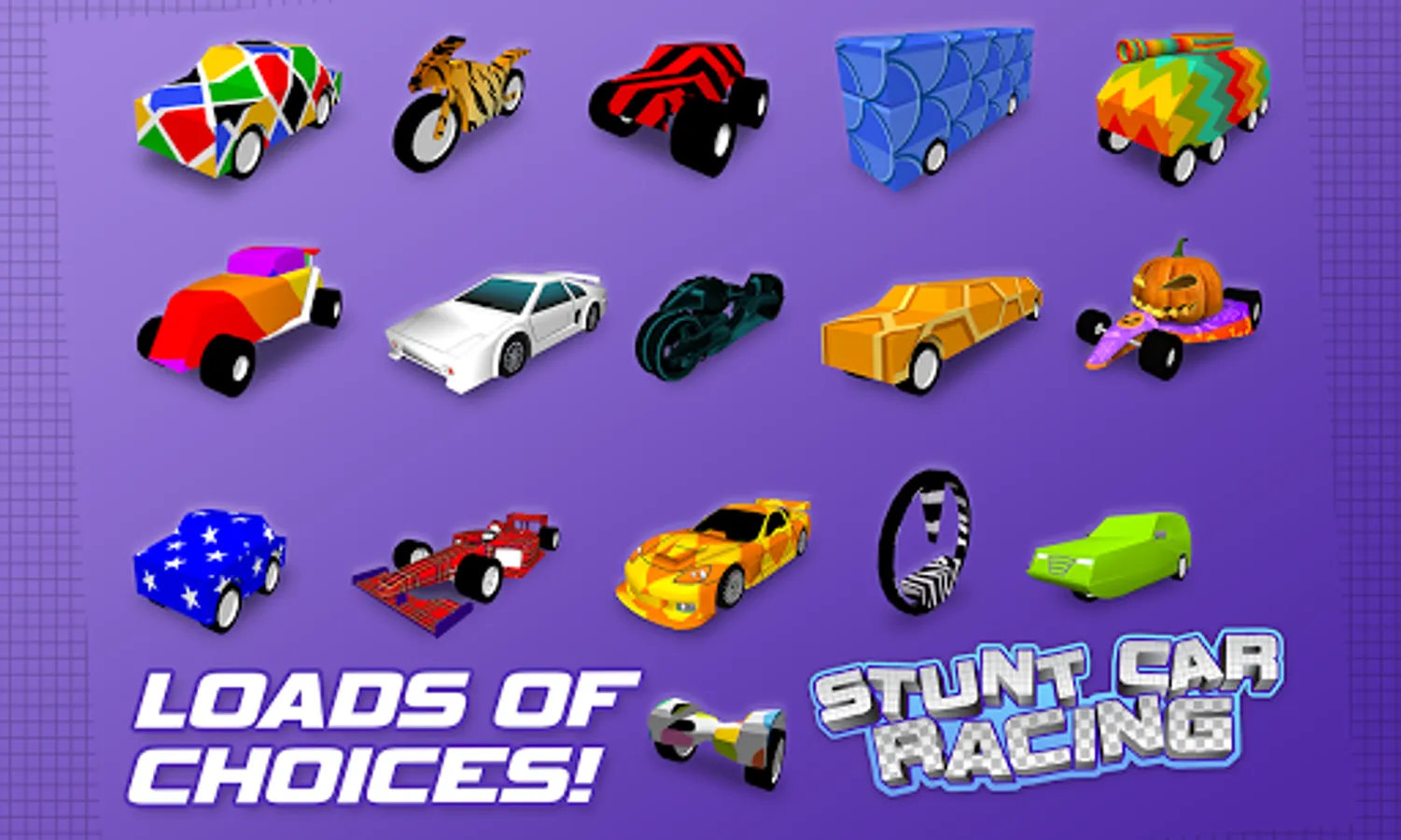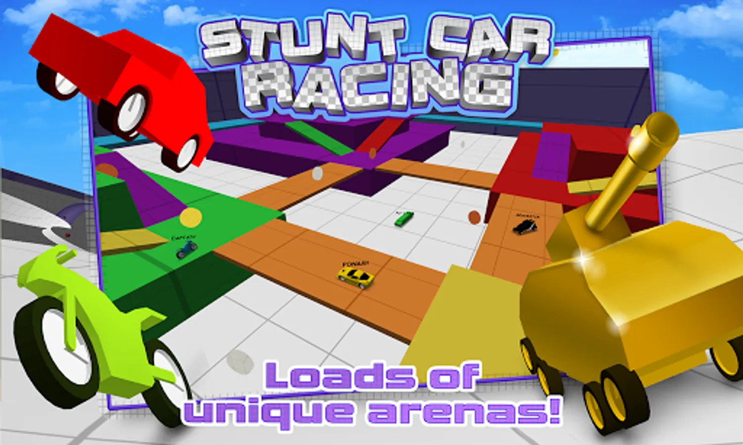 Multiplayer stunt racing action awaits you in the Stunt Car Arenas! Race and chase your opponents to become a stunt driving expert and master each game mode. Use your winnings to upgrade and customize your car or choose to buy brand new vehicles!