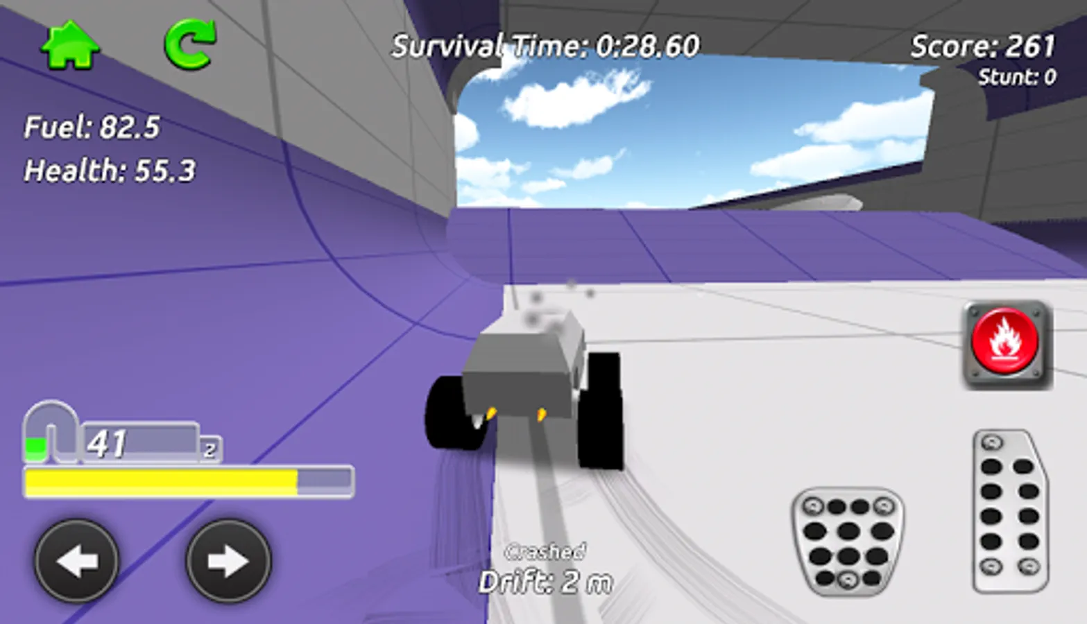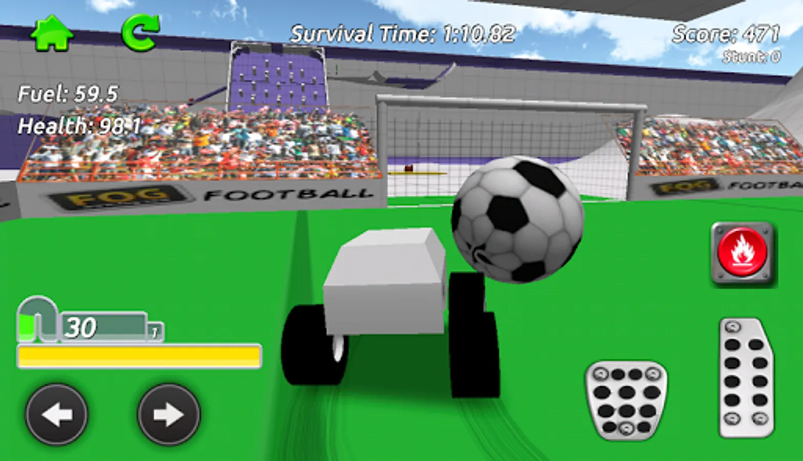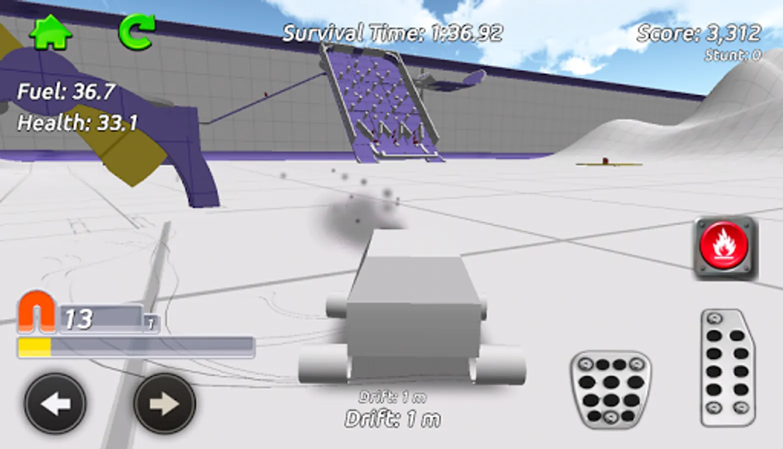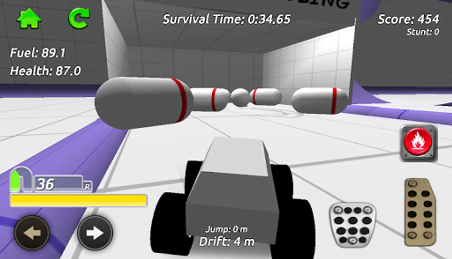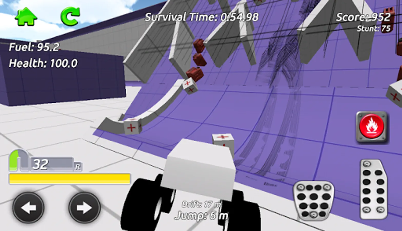 Go anywhere you want in the sandbox arena whilst collecting fuel and health pickups to keep your truck going, your fuel is always running down so find as much as you can. The pickups are hidden everywhere around the arena, take on the obstacles and challenge games including Football and Bowling as you try to find them all! Earn stunt score as you drive around by performing jumps and drifts.