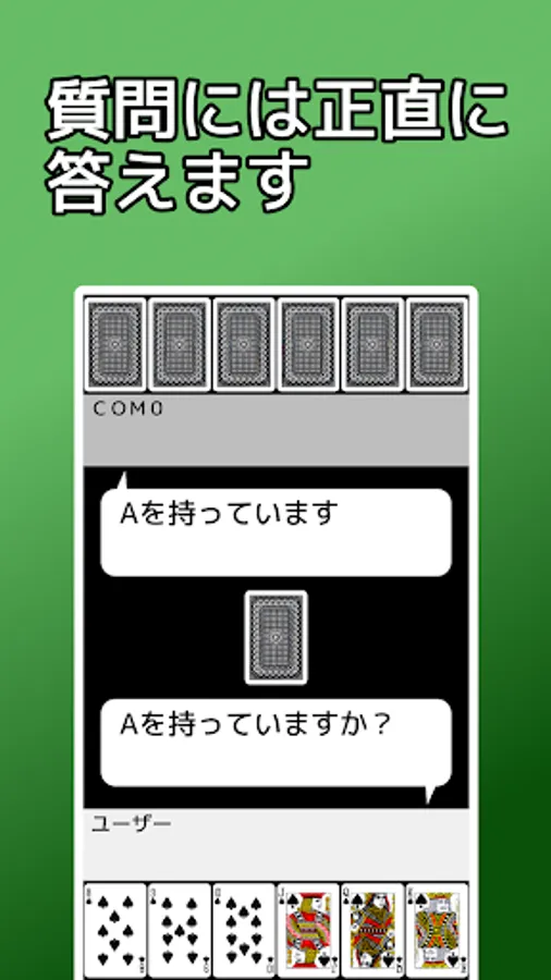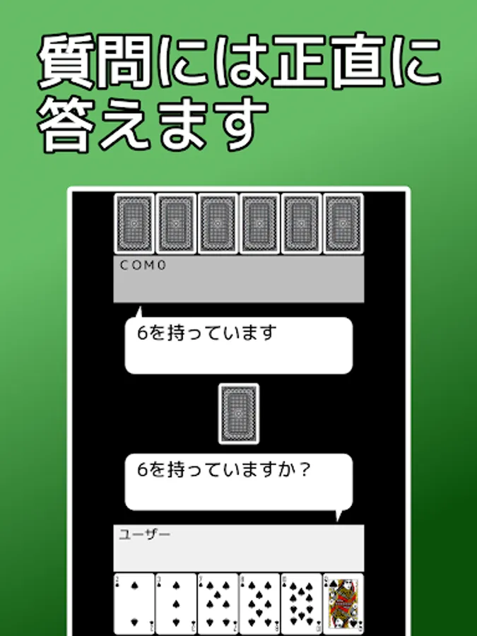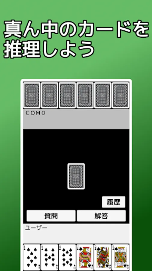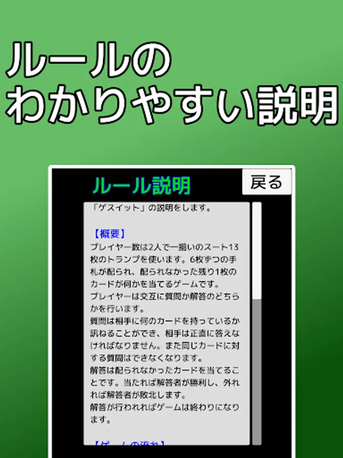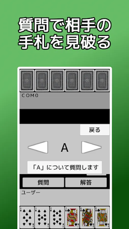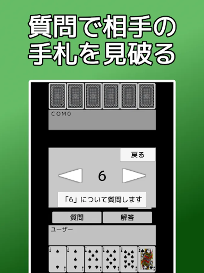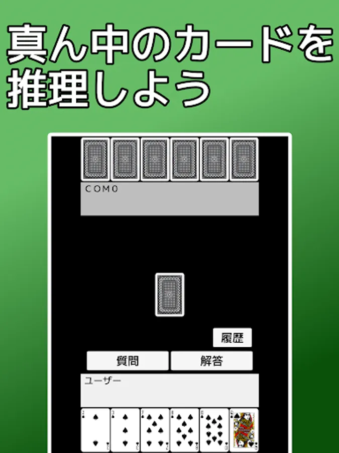 The number of players is 2 and 13 cards from A to K are used. It is a game in which 6 cards are dealt and guess what the remaining 1 card that was not dealt is. Players take turns either asking questions or answering.