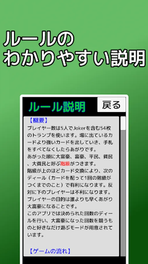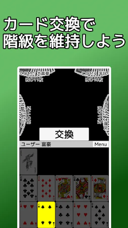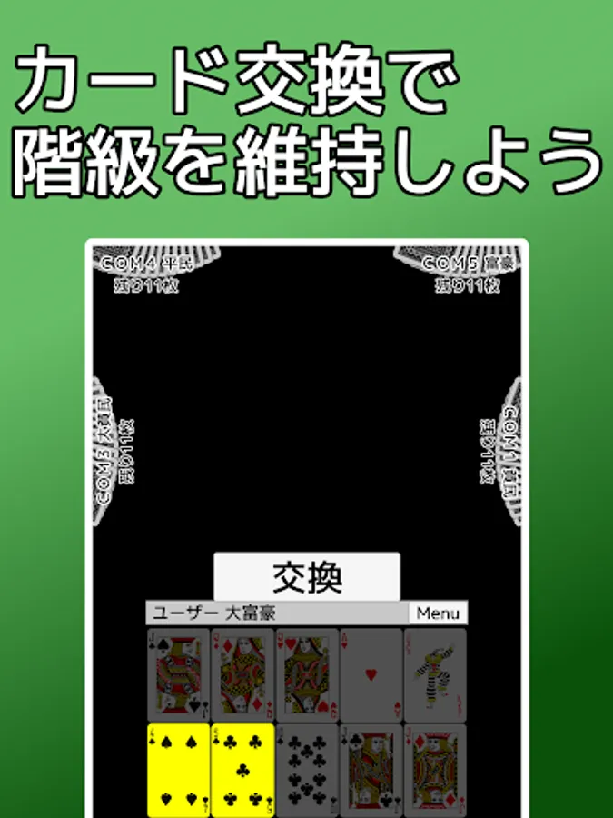 In order of appearance, the ranks are large, rich, commoner, poor, and great poor. In the following games, it is easier to fix the class by exchanging cards. The real pleasure of the game is to maintain the upper class and rise from the lower class to the upper class.