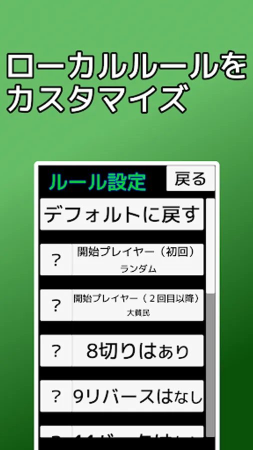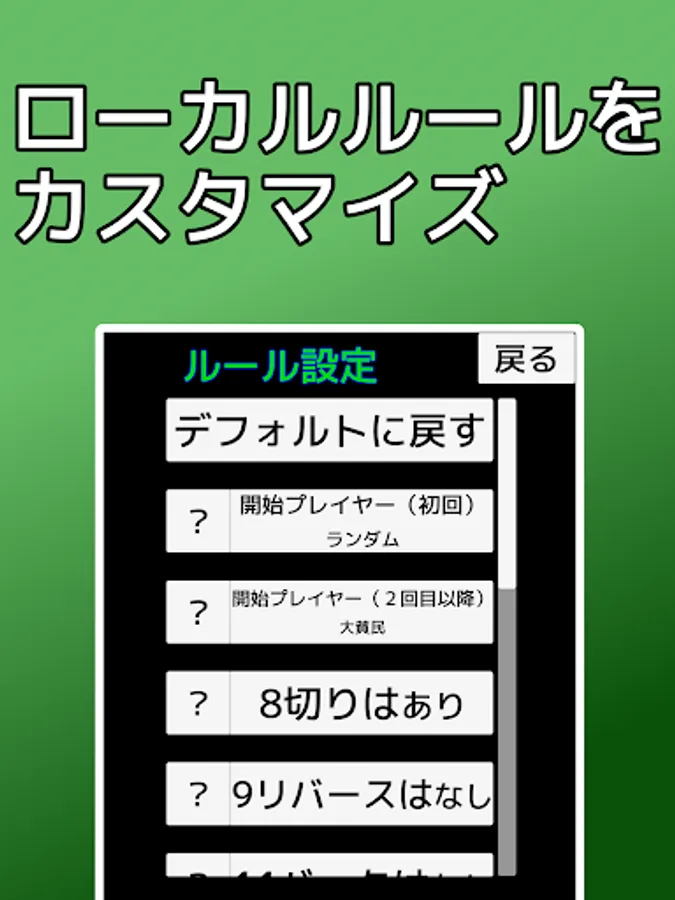 There are various local rules. You can set the following local rules in this app. Please enjoy different ways of playing with various combinations. The more complicated the rules, the more the game changes from a game with a strong luck element, which is determined only by the hand dealt at the beginning, to an intelligent game that requires advanced strategies.