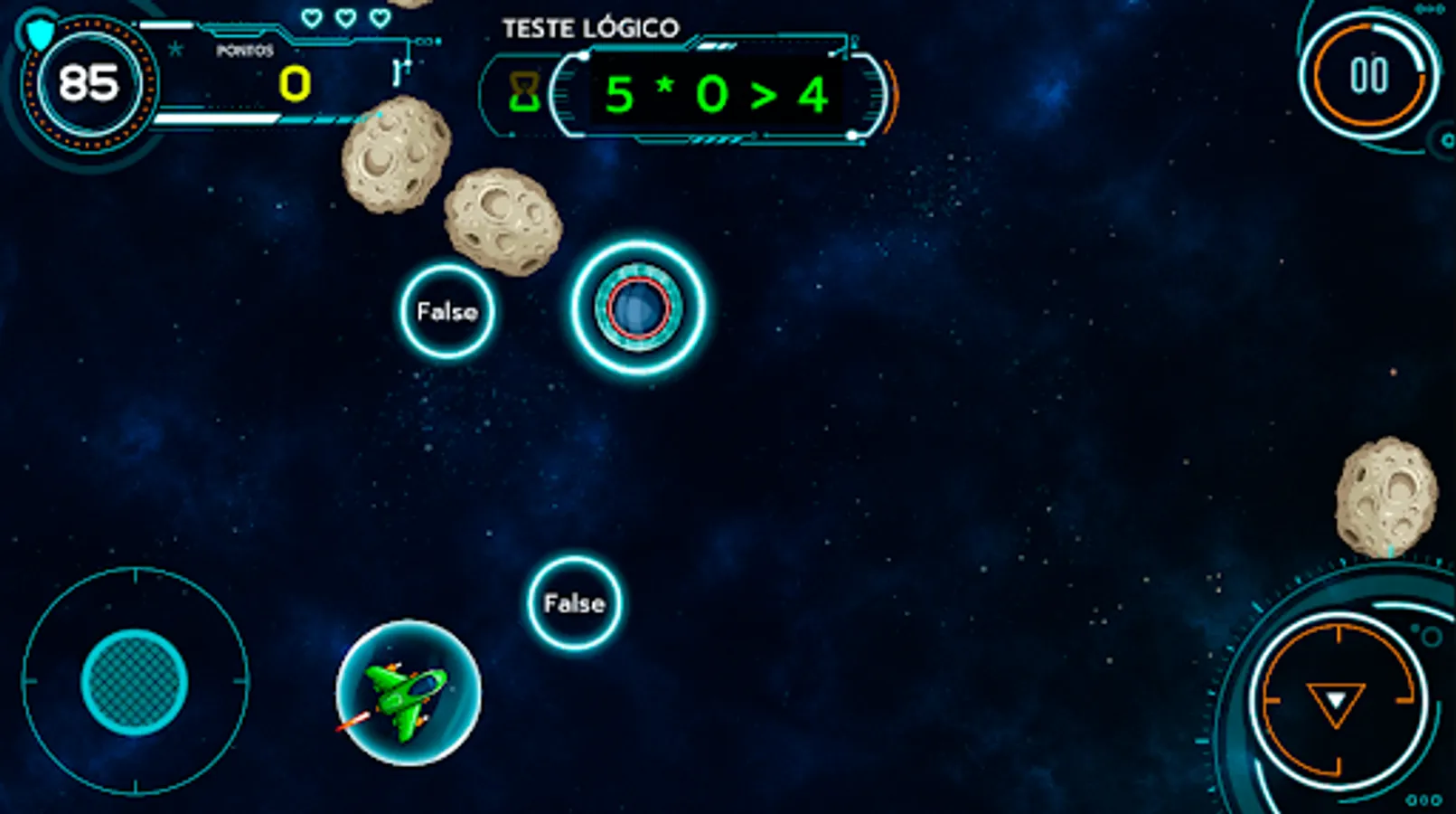 It is a spaceship game that you must control, avoiding asteroids, fighting enemy ships and adding ranking points when validating logical tests by collecting "bubbles" with logical values that match the logical test presented in the phase. By leveling up you can unlock more powerful ships.