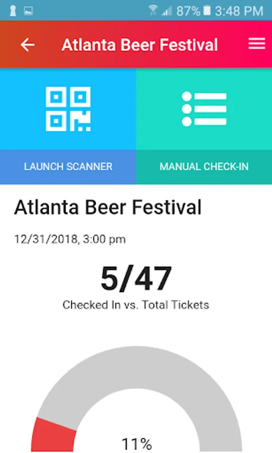 The app gives you a summary of how many tickets have been sold to your event, how much revenue you have collected and how many tickets have been scanned in.