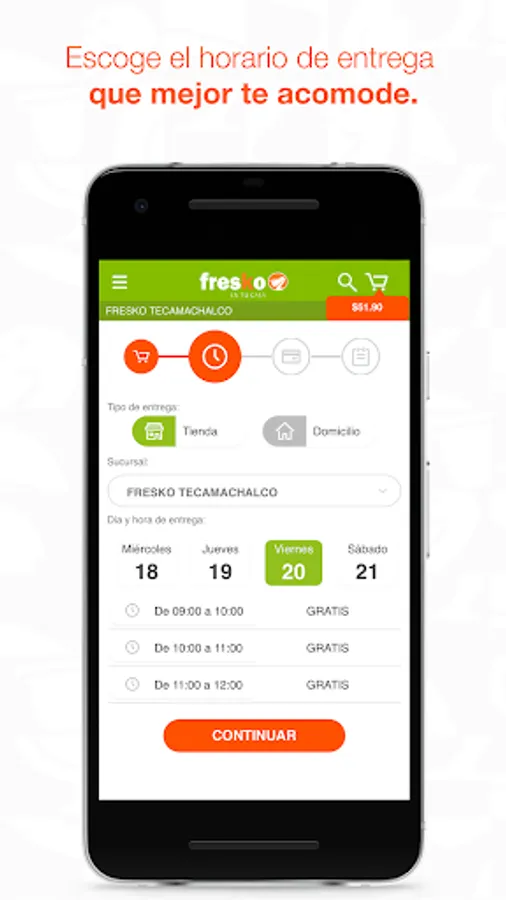 Fresko in your home is our delivery service. You can receive your order in the comfort of your home or office. In Fresko you will find a great variety of products and services so that your purchases are quick, comfortable and safe. We offer two modes of delivery of your order to use the one of your preference. At the time of registration, we will inform you immediately about the service we have available to place your order.