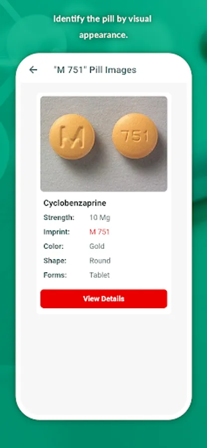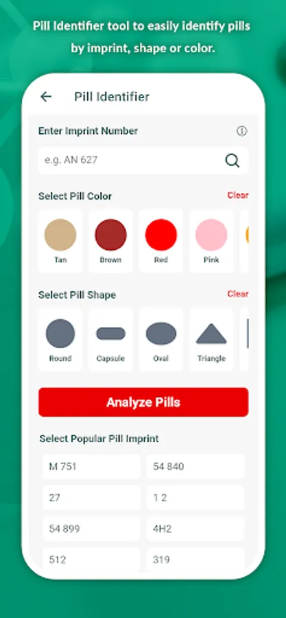 You can identify pills using the app based on size, shape, color, imprint, or name of a pill.
