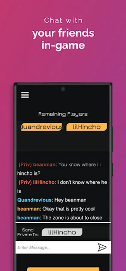 SBR brings the battle royale game outside on your phone. A zone is initialized around your area and you can invite your friends to join your game. The zone shrinks and damages your health if you are outside it. You eliminate other players by taking a picture of them. If the picture you take is not clear, others may vote to cancel the elimination. The last player standing wins the game.