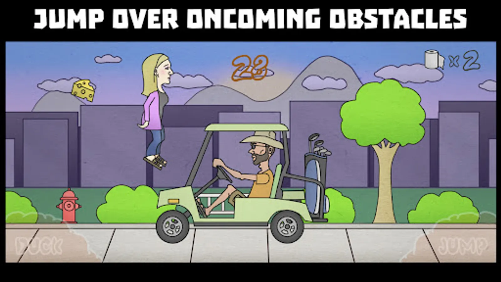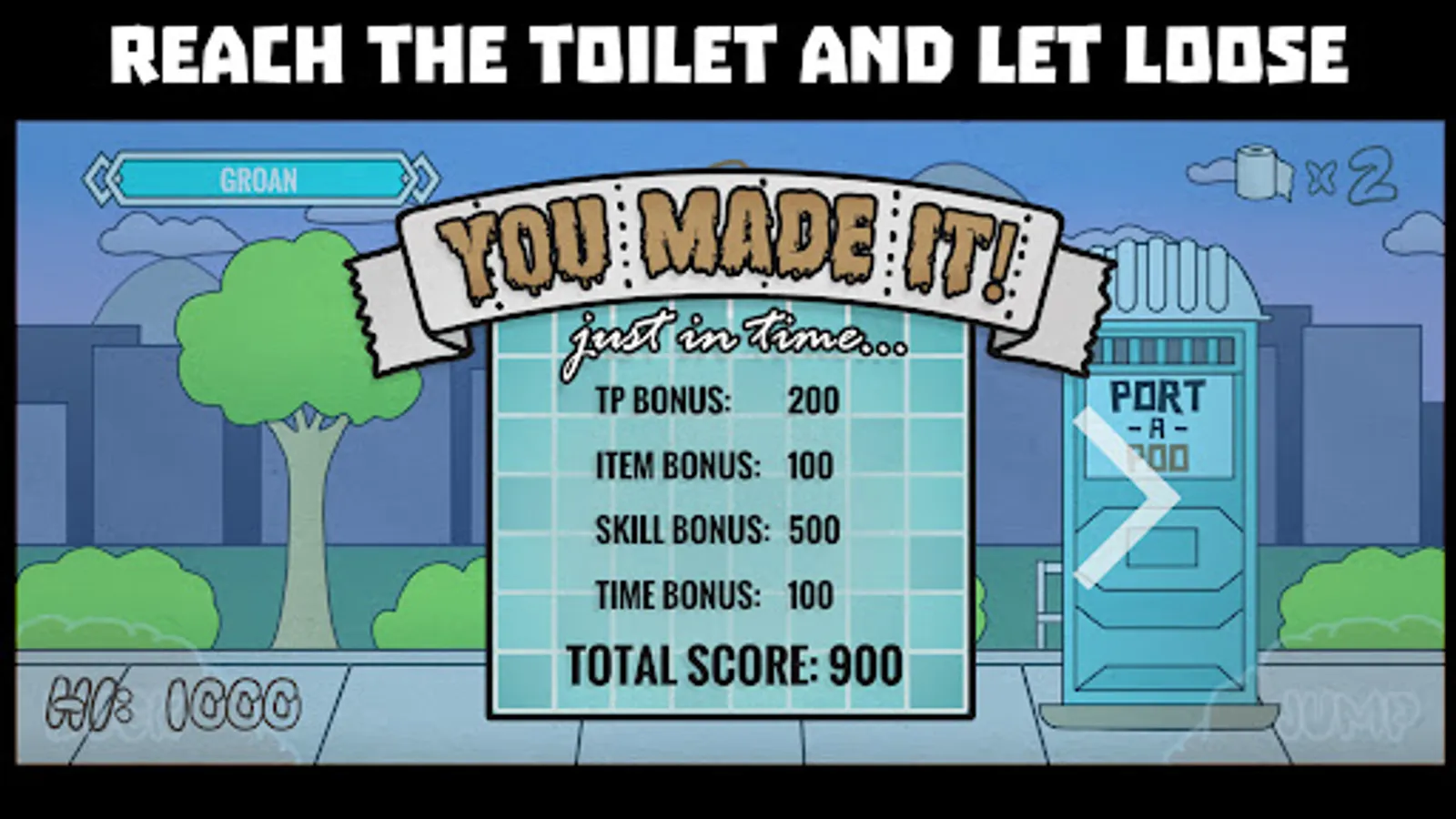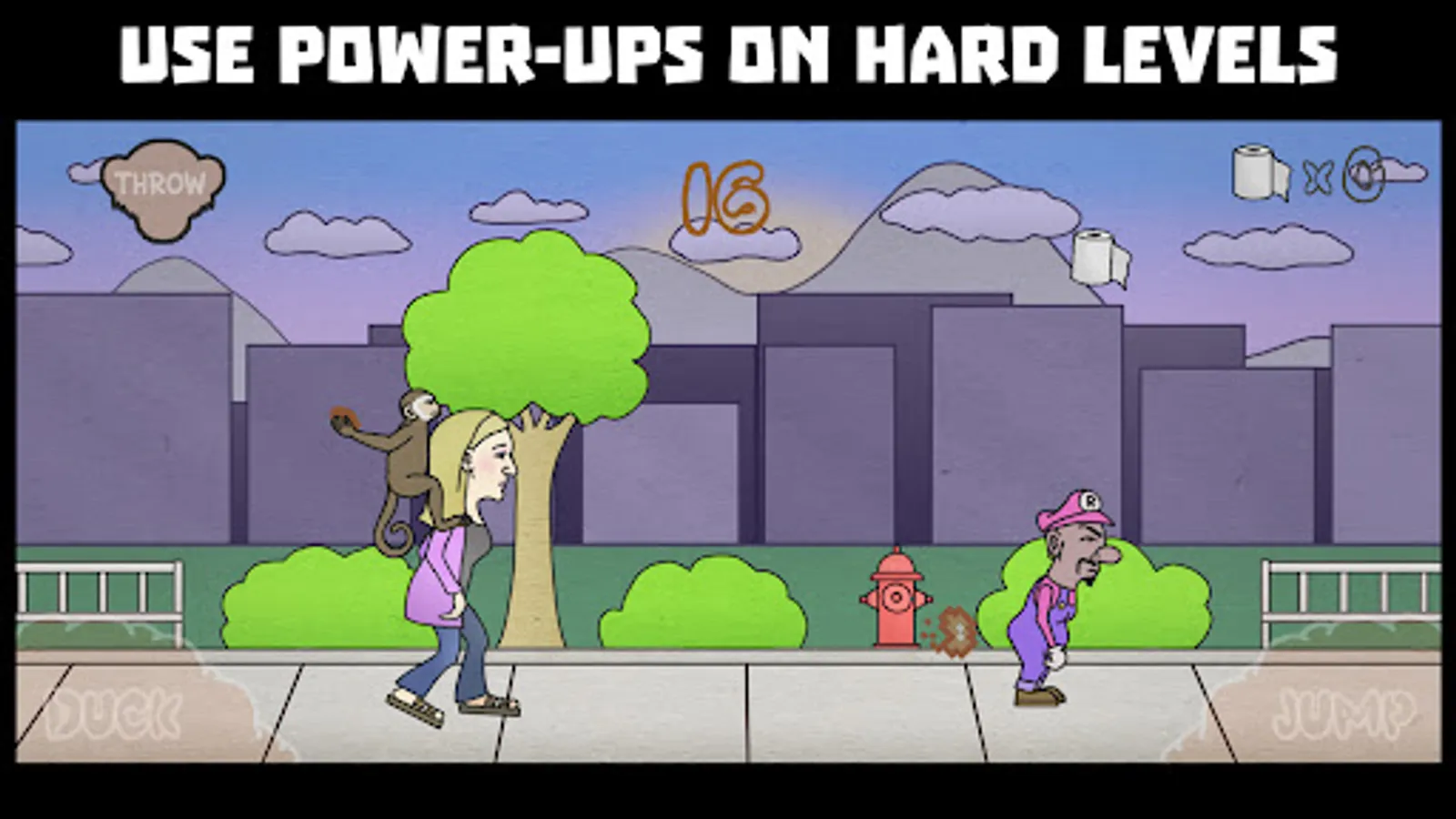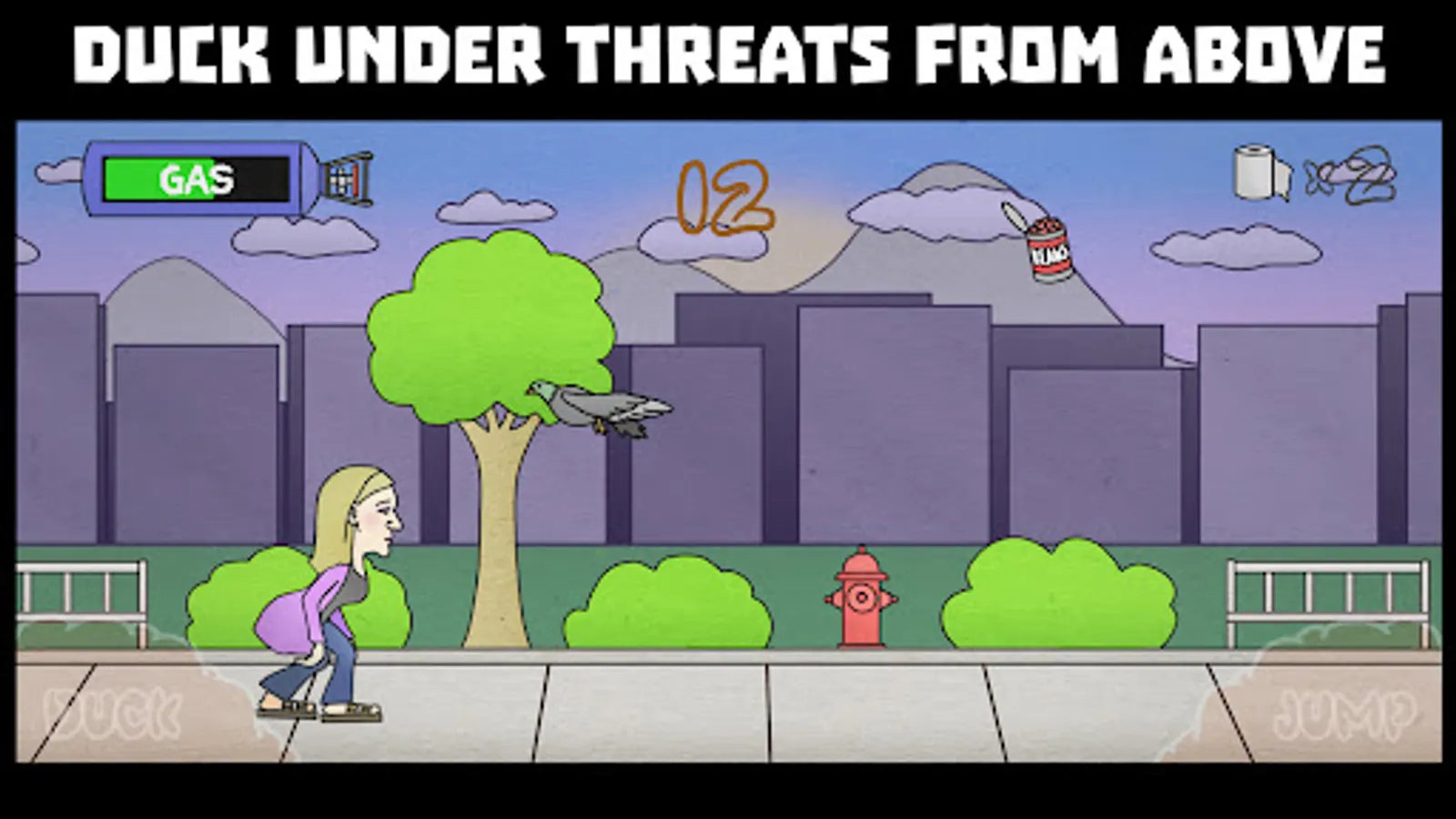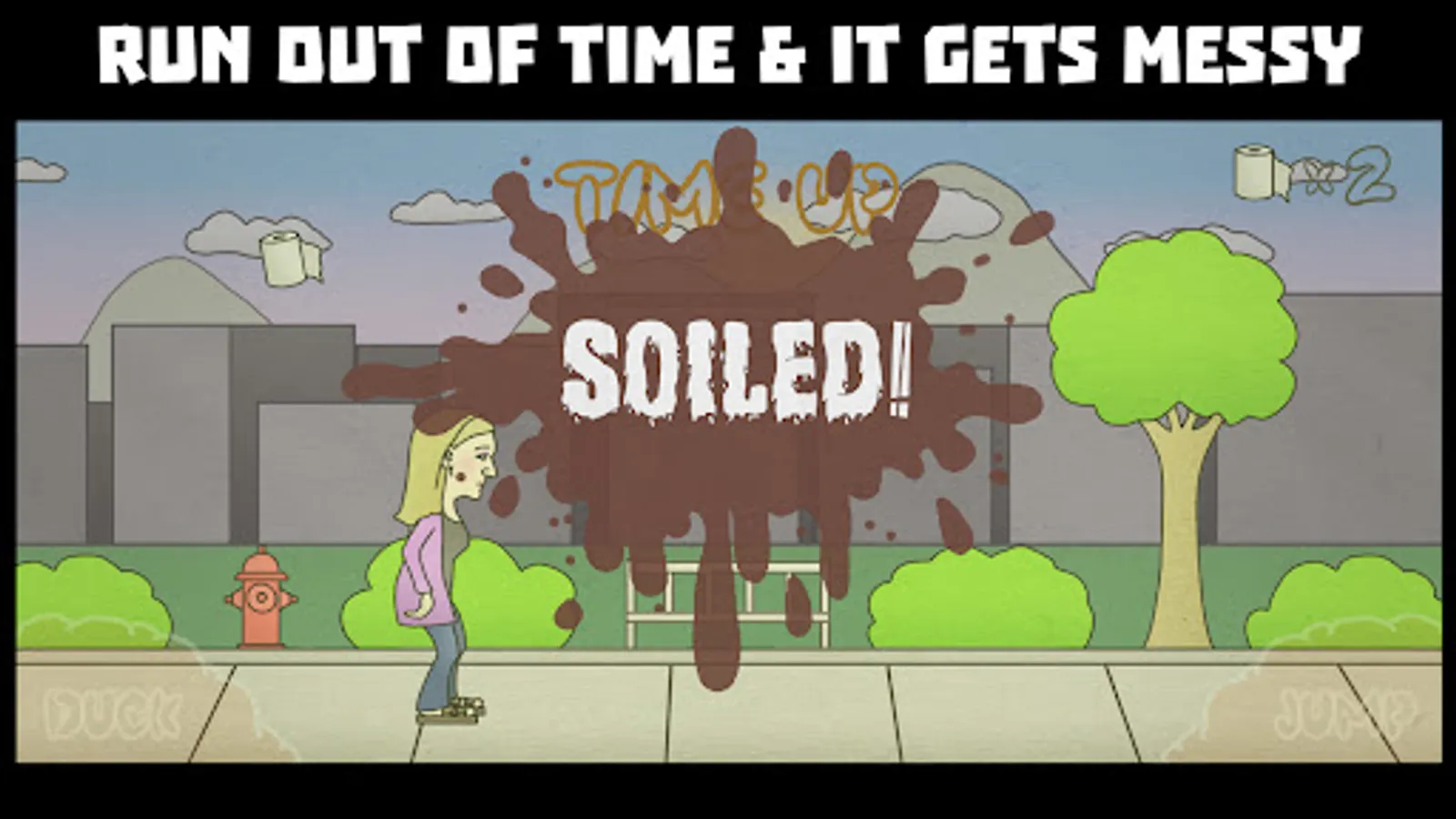Help guide Steff through a barrage of obstacles blocking her path on the way to relief. There are animals such as ducks, frogs, and pigeons, as well as paper planes, lawnmowers, and drones. There is also a cast of devious characters who will run Steff over with bikes and golf carts, as well as throw boomerangs at Steff's head. There are power-ups to help Steff on her mission, including a tank filled with flatulence thats boosts Steff high into the air, a painful groan that releases a powerful burst of energy, and Steff's pet monkey Richard who slings his poo at unwitting opponents. Reach the Port-a-Poo before the timer runs out to pass the level and to pass lunch. If you fail, Steff fills her pants.