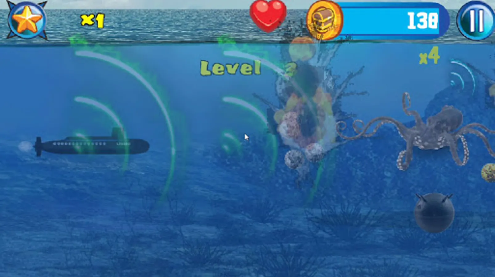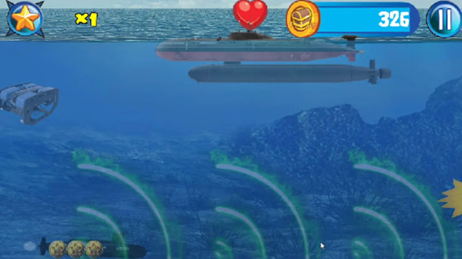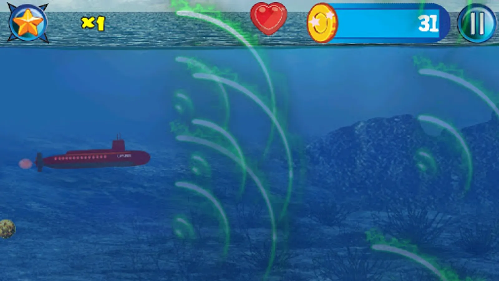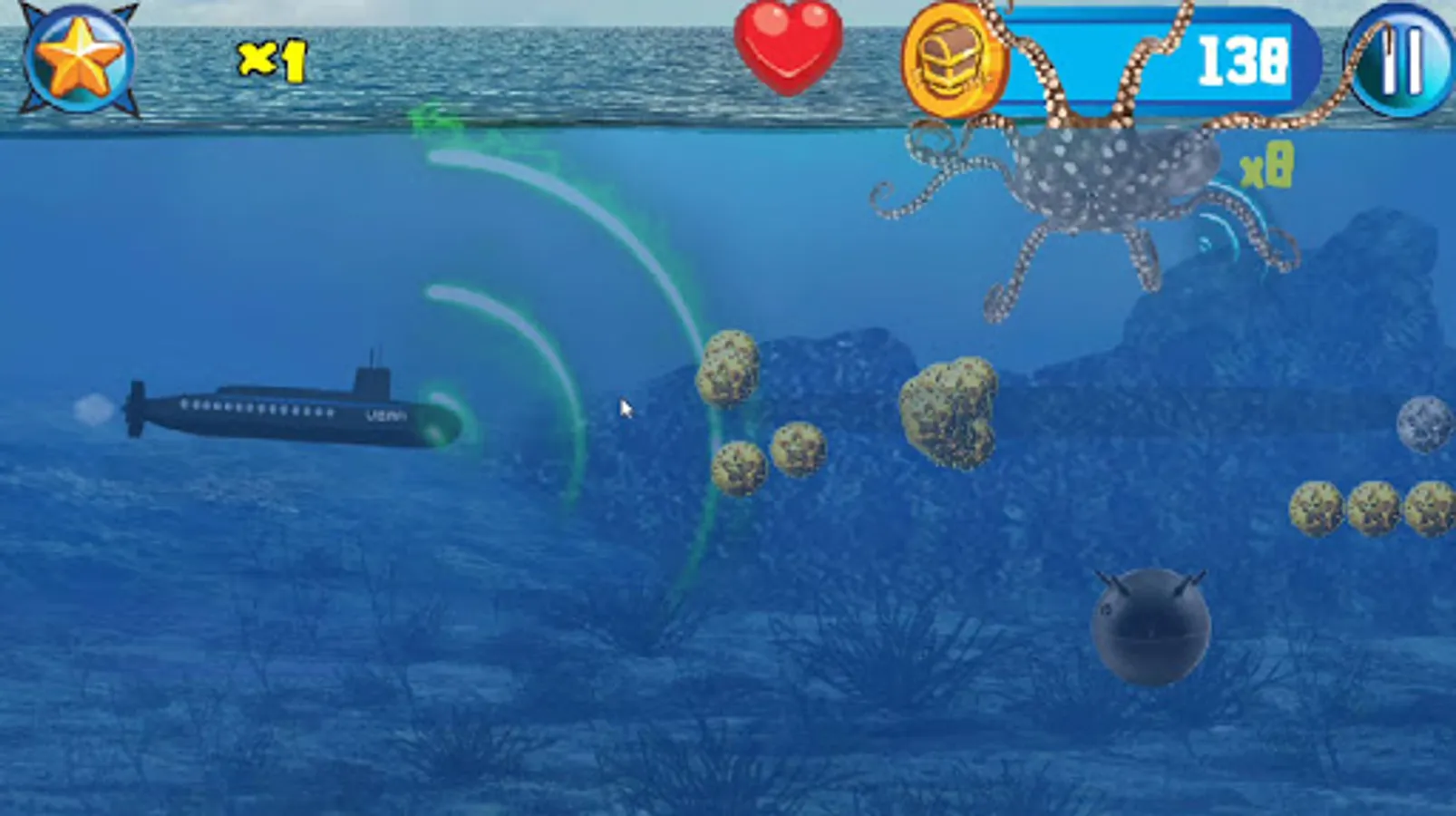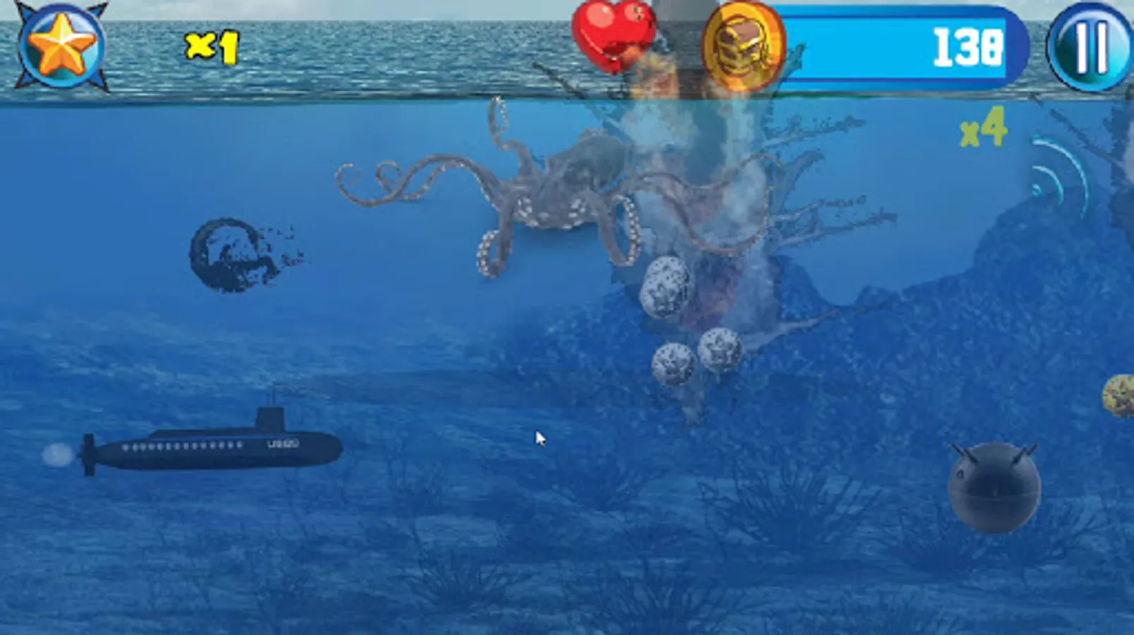 Captain Wanted! In this military navel warfare game you play a submarine captain battling Akula class submarines and battle sea creatures like a giant monster ink spitting octopus, Navigate trying to avoiding sea mines and being imploded in this underwater world war II deep sea action endless side scroller.