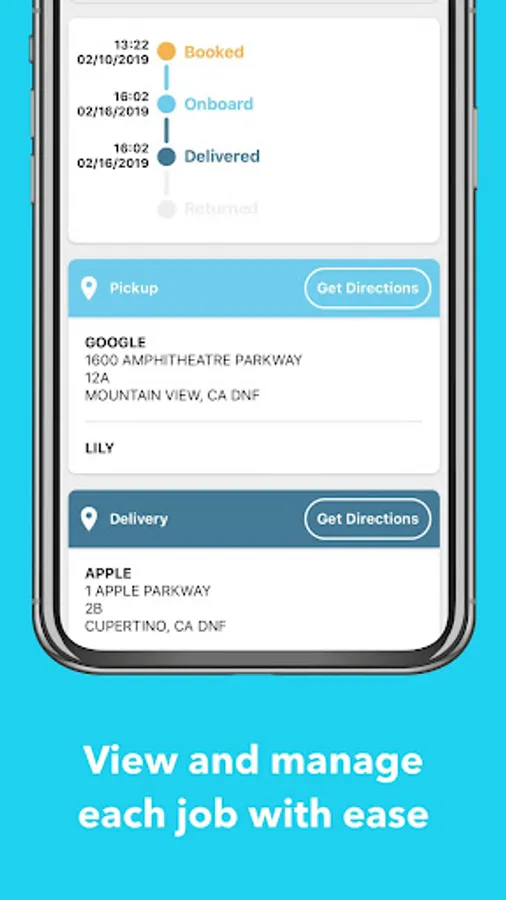 Integration with both Apple Maps and Google Maps, allows drivers to get directions to a job's pickup or delivery address with the tap of a button.