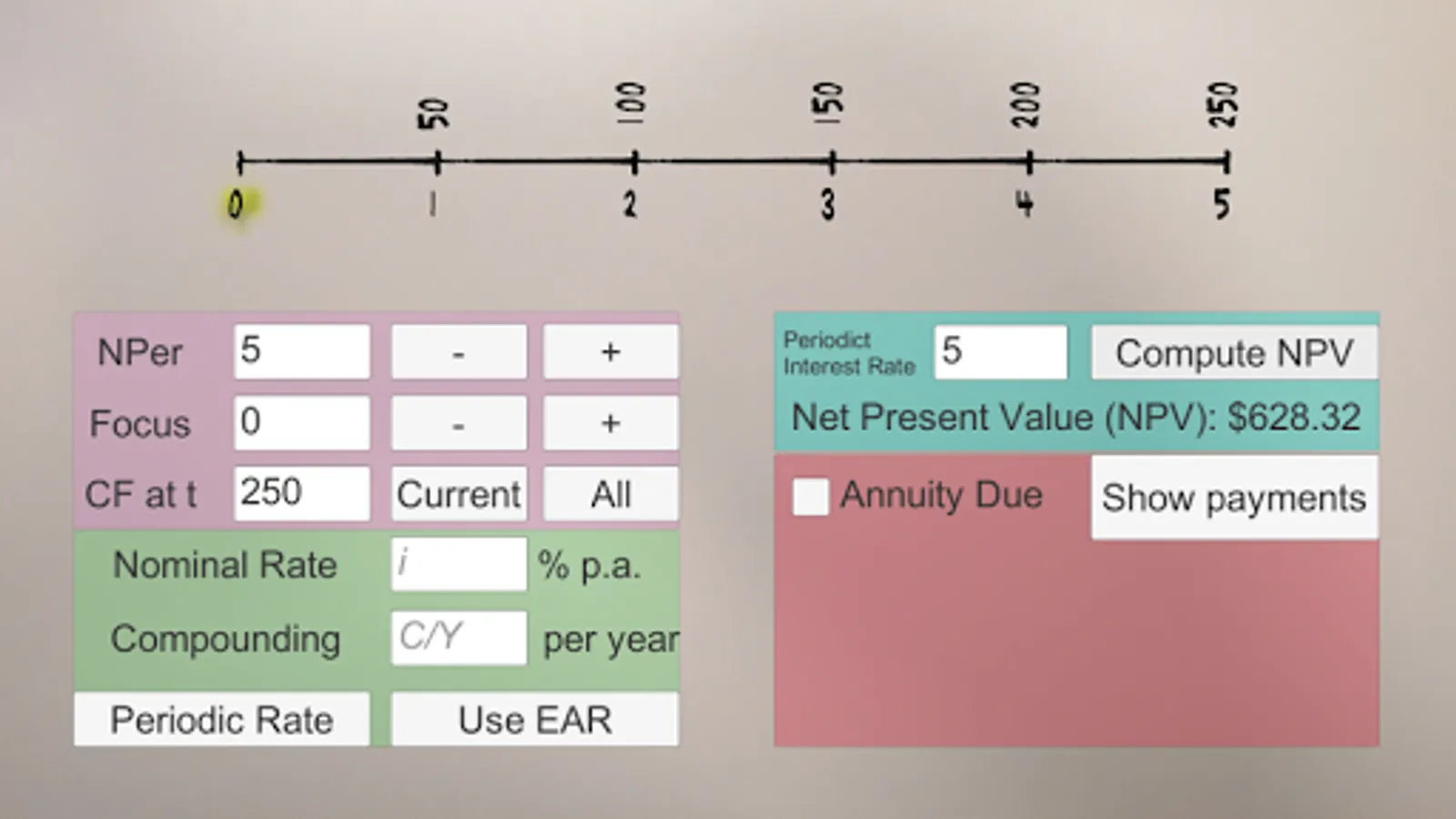 Find net present value, calculate loan repayment amounts, calculate required payments for desired retirement amount. Support for irregular and regular cash flows and you can even estimate net present value of a constant perpetuity (by using large number of cash flows). Included calculator for Effective Annual Rate as well as Periodic Rate.