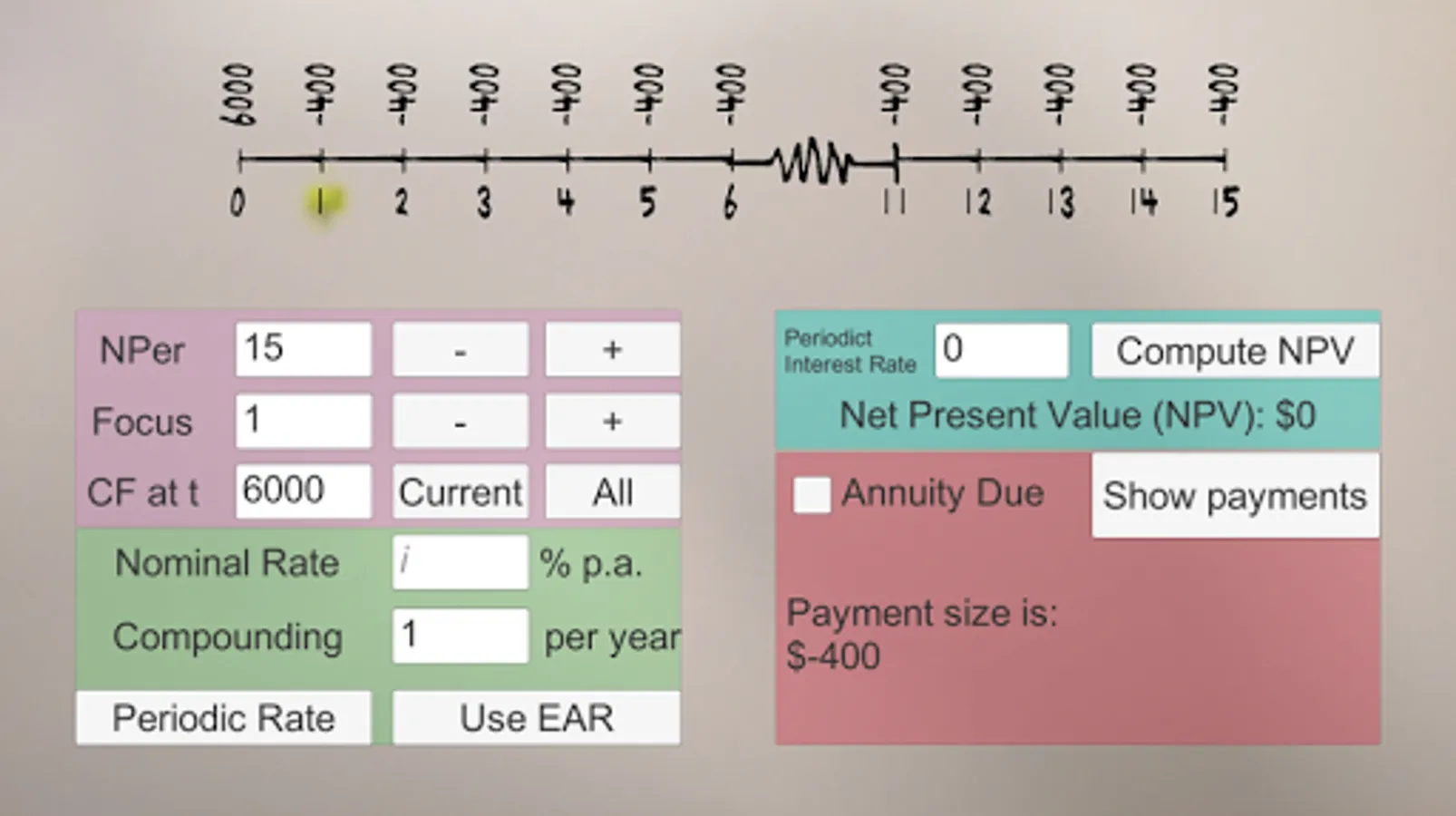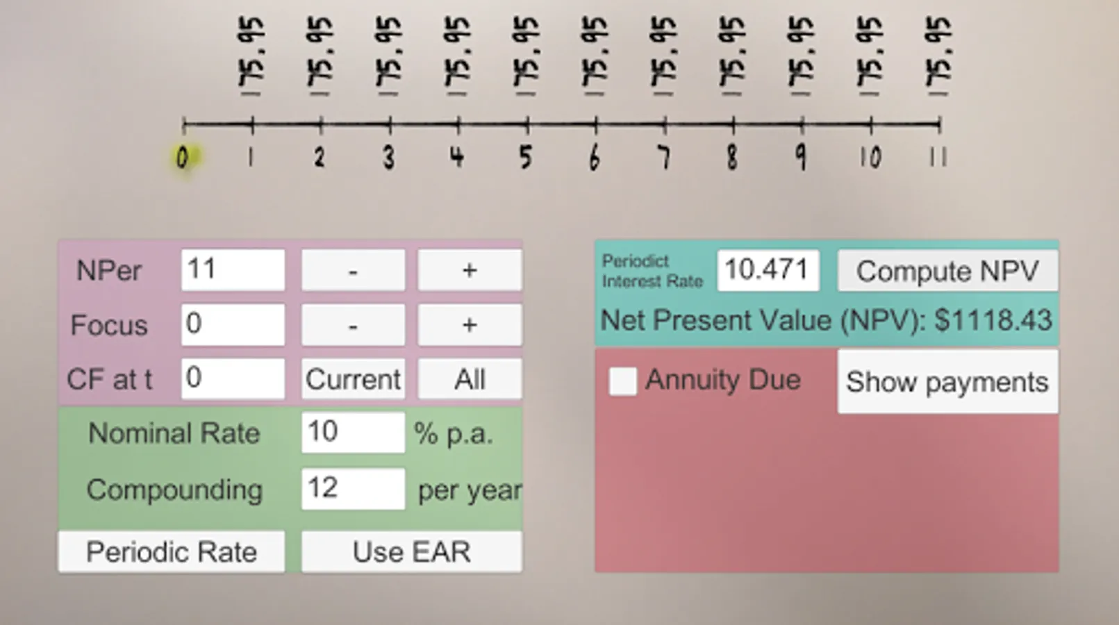 3. The [Use EAR] button calculates the effective interest with periodicity of a year given the nominal rate and number of compounding periods per year, again the result is set as the periodic interest rate.