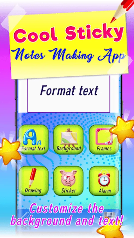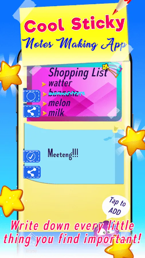 Choose the character that suits you the best and decorate your colorful sticky notes! This notes making app will show you a lot of backgrounds in different colors and designs, cute frames and stickers! Using πCool Sticky Notes Making Appπ you can write down your to do list and you will have the most creative and ''cute sticky notes''. When it comes to secure notes app, we can say that you won't find more awesome app! This sticky note widget gives you an opportunity to create personalized sticky notes and to make them decorative! Get our simple notepad app, put them on the desktop, and don't feel anxious about your daily routine! You will do everything just on time! There is no time for thinking twice, get this cool reminder and share it with everyone!