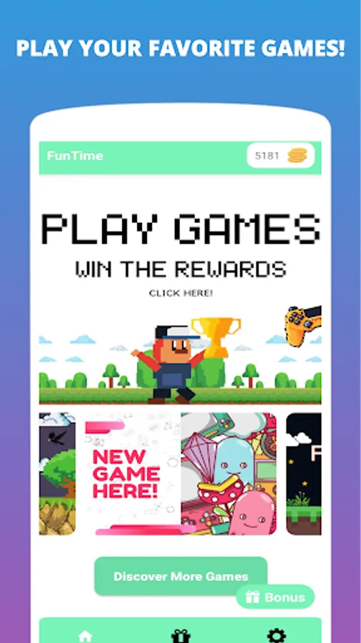 FunTime contains various game types such as Casual, Strategy, Action, Puzzle, Adventure, Arcade, and many more. You can play ANY game you like and start collecting coins!