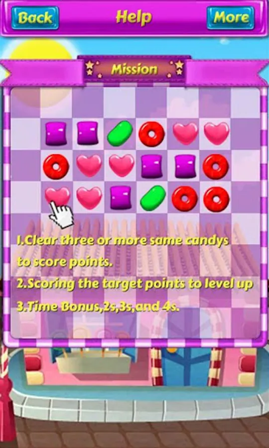 1.Swipe your finger across three or more matching pieces of candy to clear them.