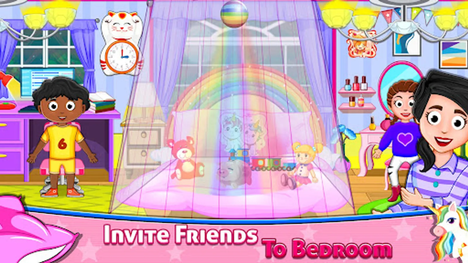 After playing games in gaming area of the royal mansion, it is not enough of a luxurious life. After going to dream bedroom take your pillows because this is time for an epic pillow fight in these sleepover games. You can also share your funny stories if you don't want a pillow fight. Share your extreme funny stories and laugh your stress out in this night sleepover game. This is time to make new memories with your close friends from town. All this fun only in my friends avatar city life house game.