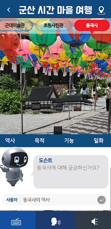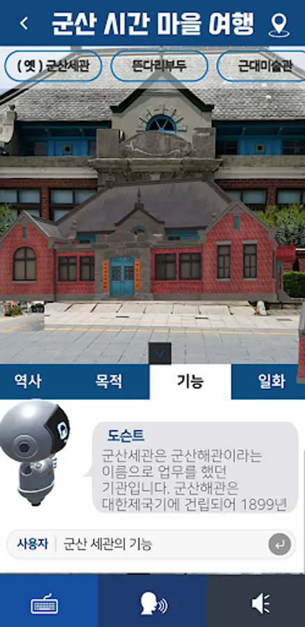 AI ChatBot Docent Kunsan Travel Guide APP is an app that provides information on five major tourist attractions in Gunsan (former Gunsan Customs, Floating Bridge, Modern Art Museum, Grassland Photo Gallery, Dongguksa Temple).