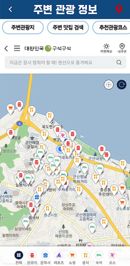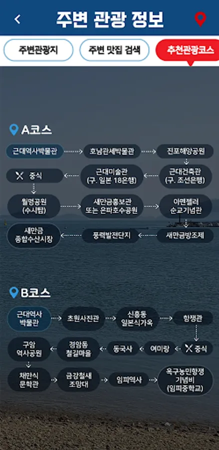 -Nearby tourist information: Information on restaurants around Gunsan (Google), nearby tourist destinations (South Korea), tourist maps for mobile, and recommended tourist courses.