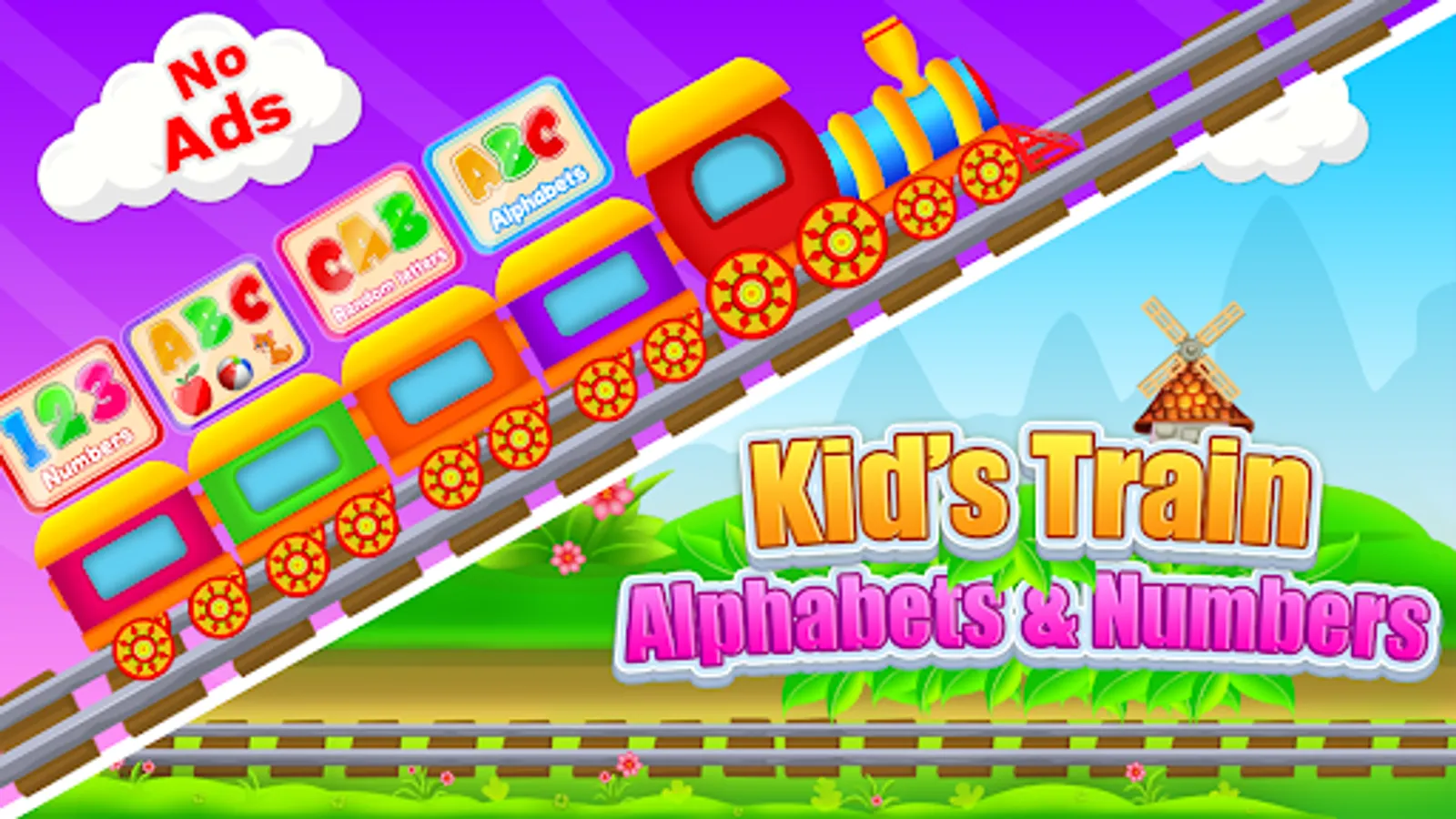 Intended for kids ages 2-7, Learn alphabets and numbers with kids Trains invites preschool-aged children to learn and identify alphabets and numbers, using trains and railroads as their tools.