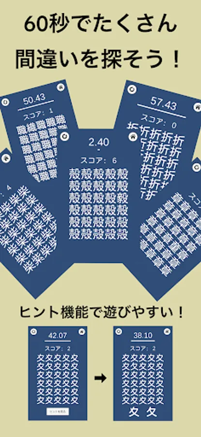 Among the displayed kanji, there is only one different kanji, so find it and touch it.