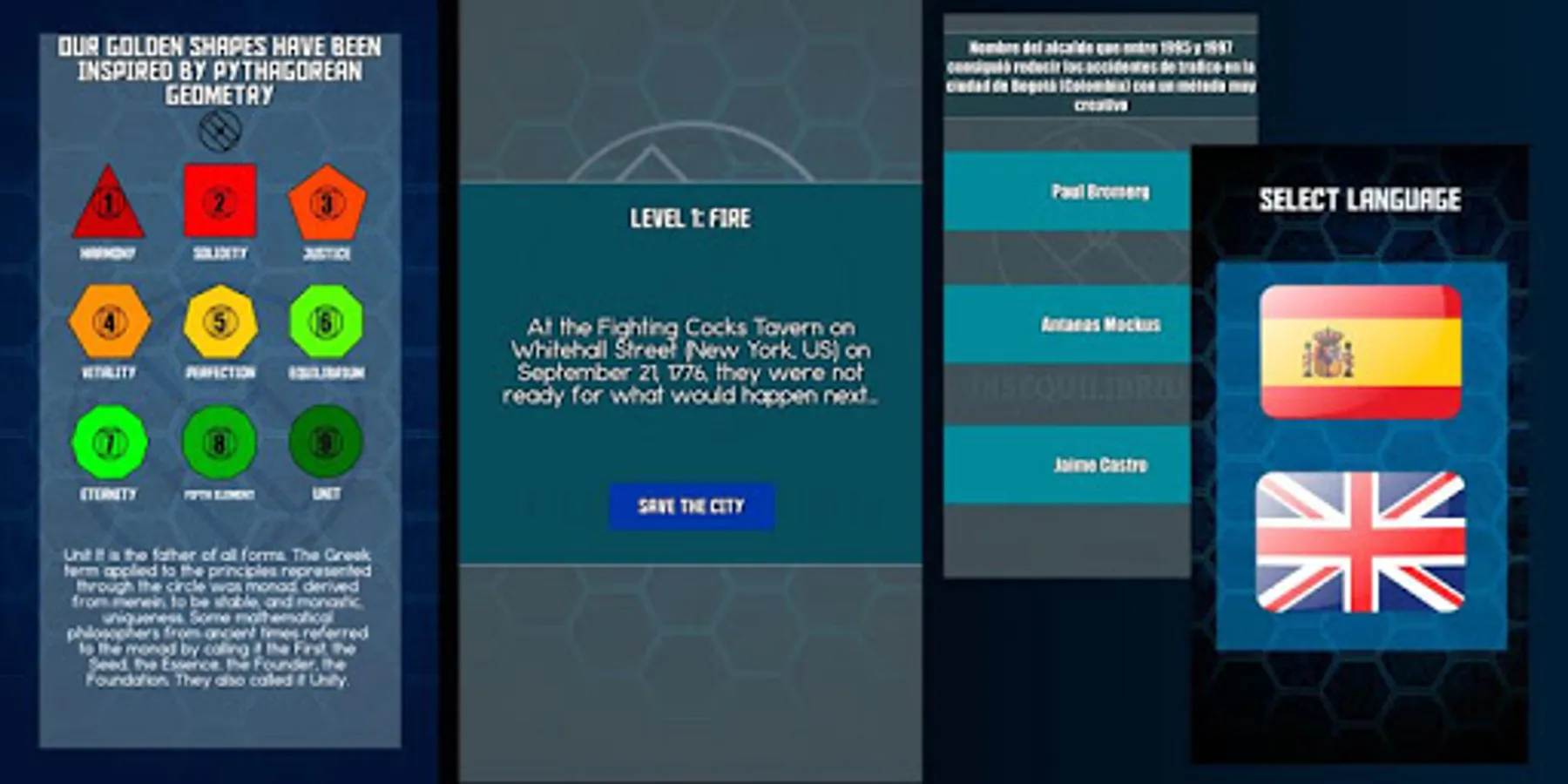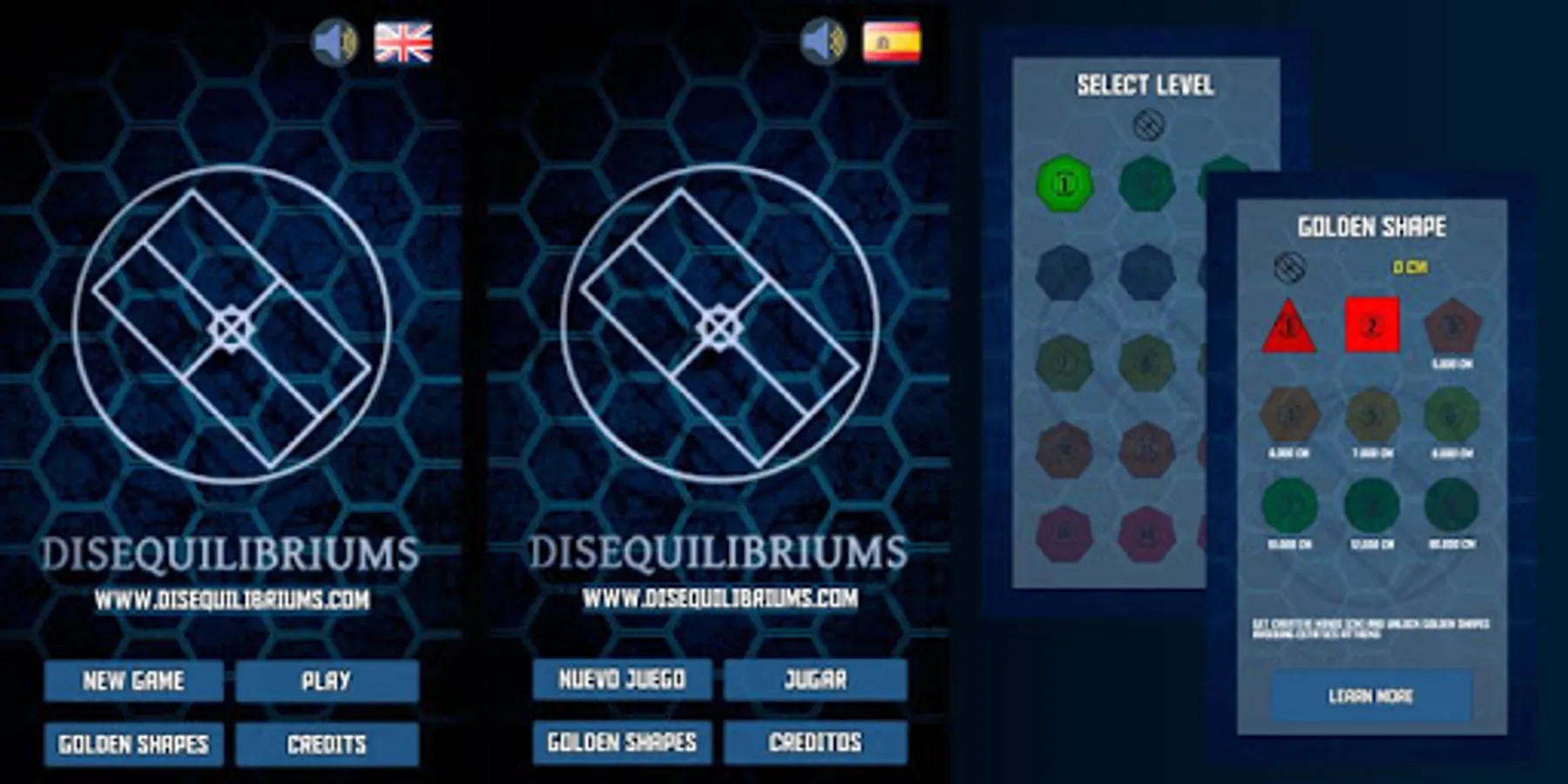 Disequilibriums is a multilanguage game where you have to save the city from an existing imbalance (fire, earthquake, ...) using the different levels that enable you the GOLDENSHAPES and avoiding the attacks of the STATICS. Add CREATIVEMINDS to unlock new GOLDENSHAPES and reach the top level.