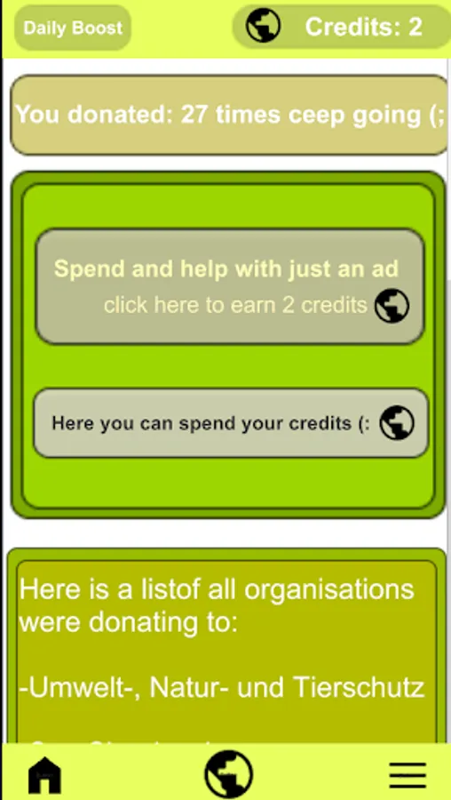 Diese App ist dazu da, um ohne Geld auszugeben Geld an vershiedene Organisationen aus unserer Liste zu spenden, welche nach Wunsch erweitert werden kann.