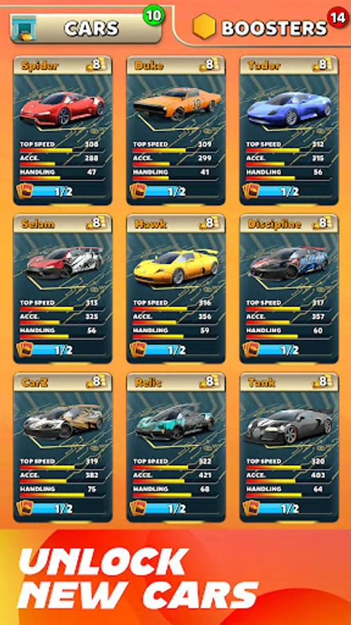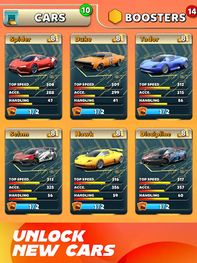 There is a long ranking list full of opponents you have to beat. Do daily missions, collect rewards and chests, buy and upgrade new cars, use boosters and beat your rivals on the rankings. Rise to the top of the rankings by winning tournaments and beating bosses, become the best racer in the world!