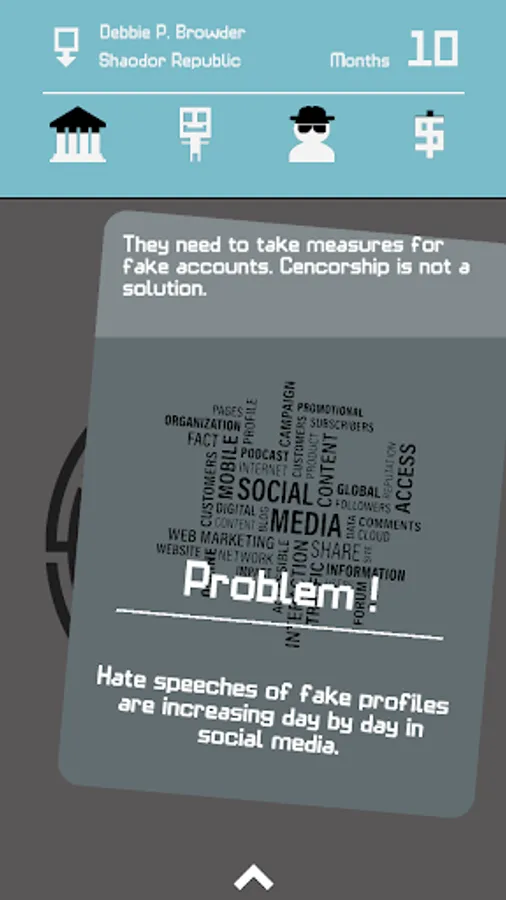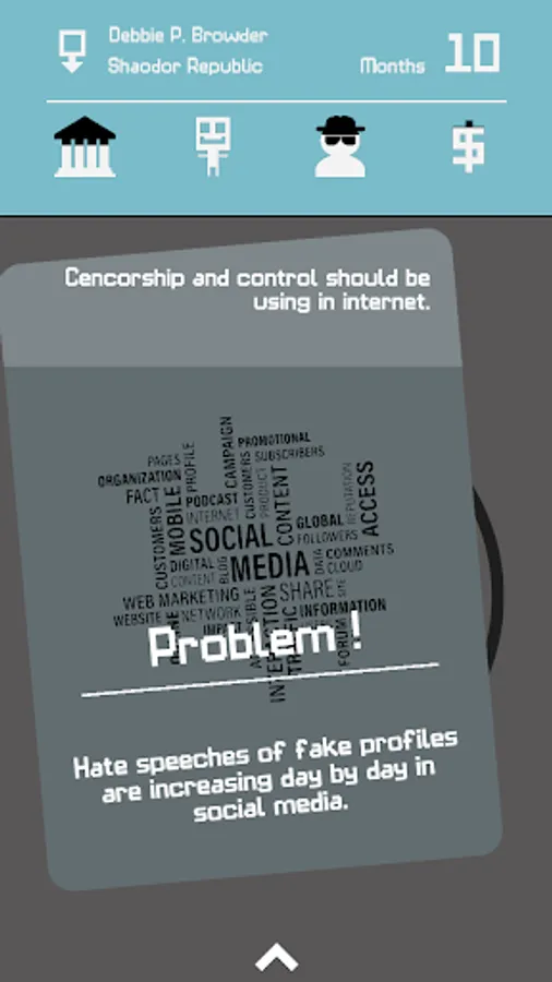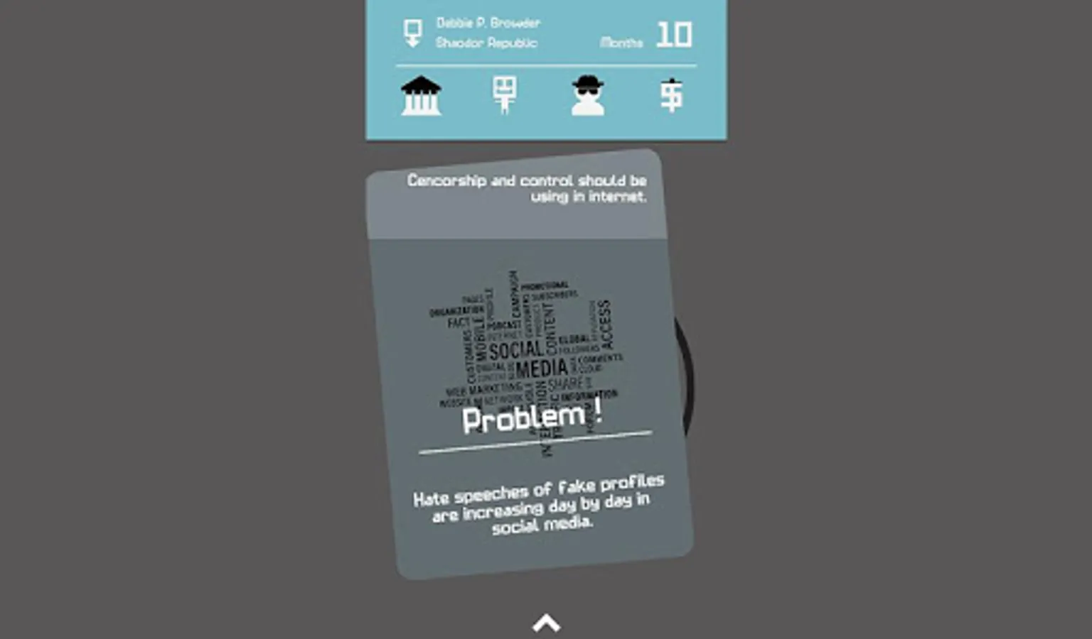 Please be careful, though. Think for a long time about your decision. Your comments can help you to rise up, but at the same time, they can cause you to fail. Who will your friends be? Who will your enemies be? Its hard to say... In this game, you will be exposed to threats, reactions, and bribes. You can't stop what happened so far, but you can still shape what happens next.