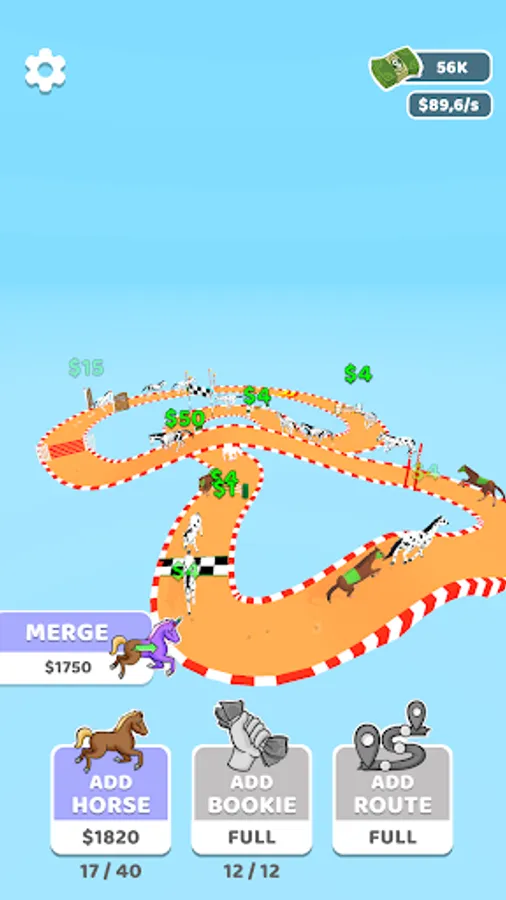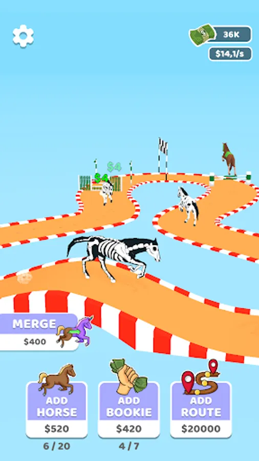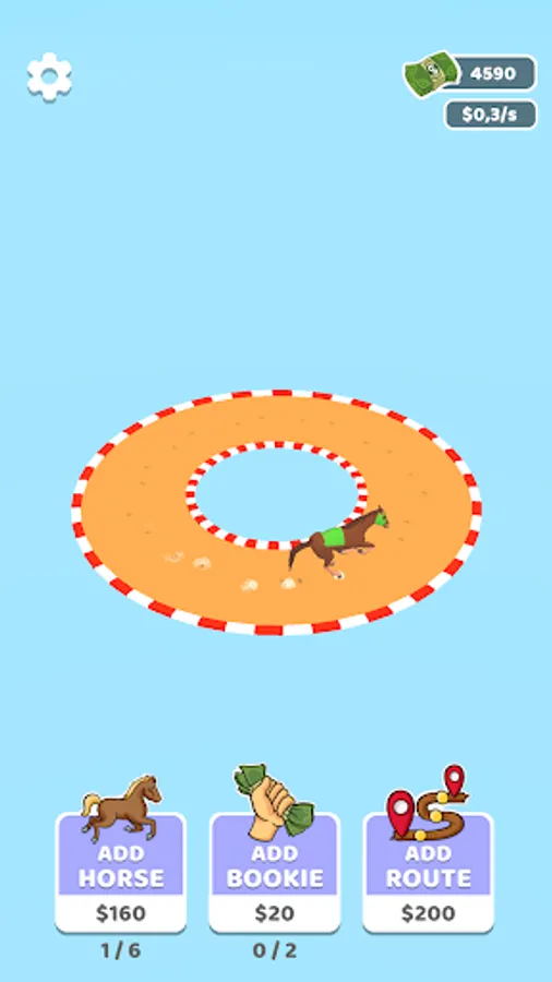 Collect money as your horse goes round. Each obstacle or challenge a horse hits will net you some bank. Grow your team and add more features to raise your income.
