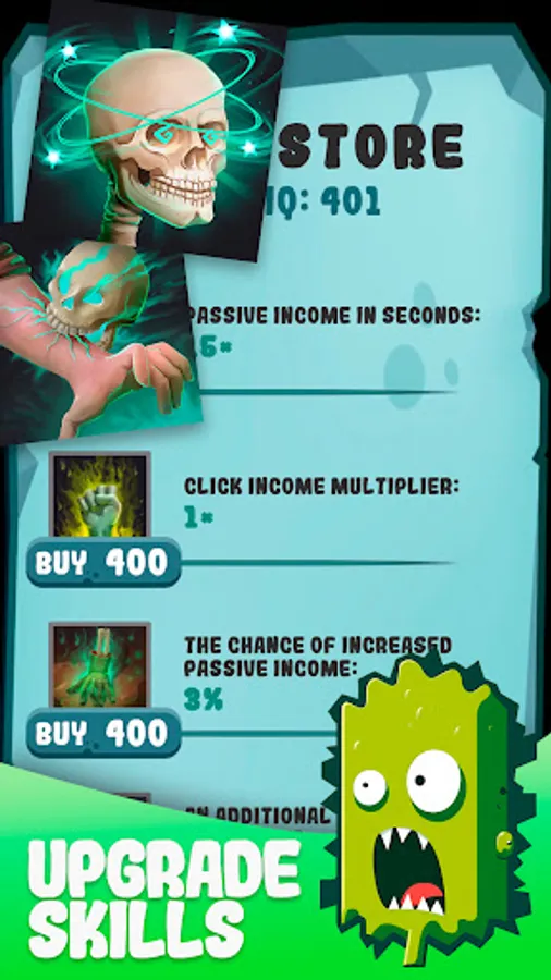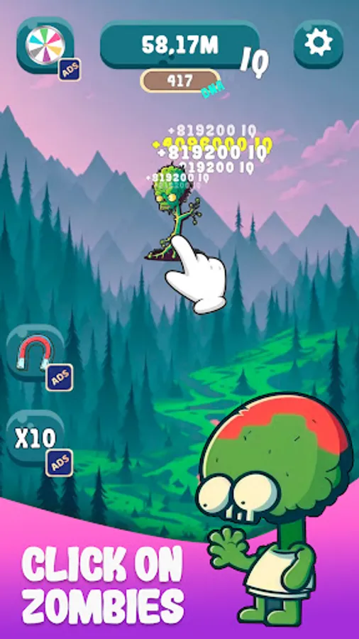 By clicking on zombies, you have a chance to get an increased number of IQ points. You can also improve different click parameters to give even more IQ per click or increase the chance to get a large number of points. By clicking on different zombies, you get a different number of points. Moving along the chain of evolution, the number of points received for clicks will be huge.