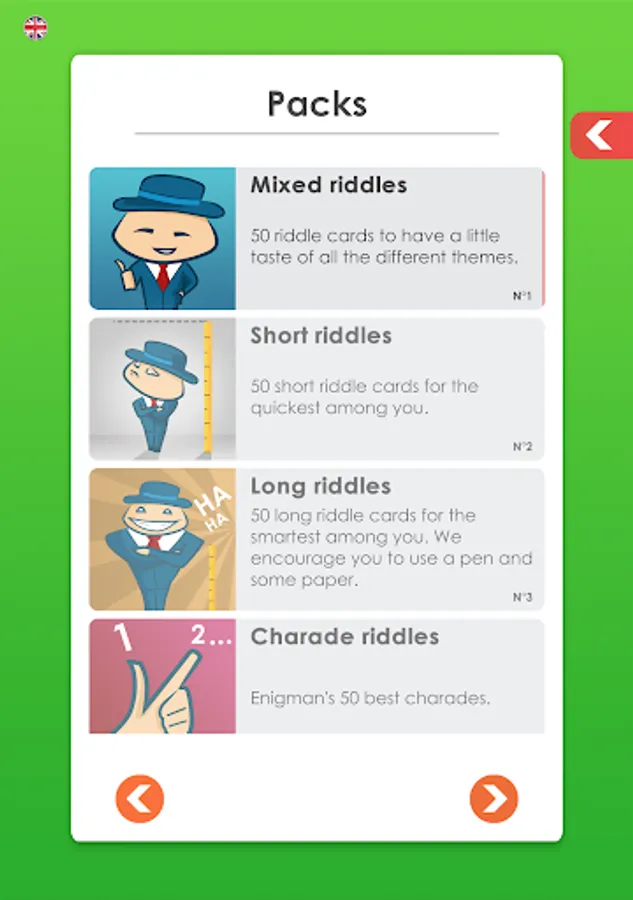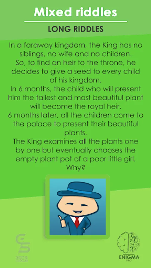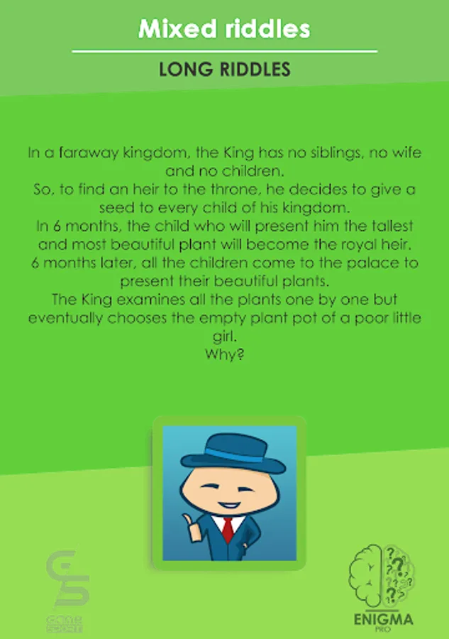 More than 1000 years worth of word games and riddles for you. Enigma Pro is the app that has the most complete riddle selection: 400 riddles created and sorted into categories: short, long, maths, charades, counter-intuitive, anagrams or mixed. Whether you're a genius mathematician, a book worm, or a troll, there's always a category for you.
