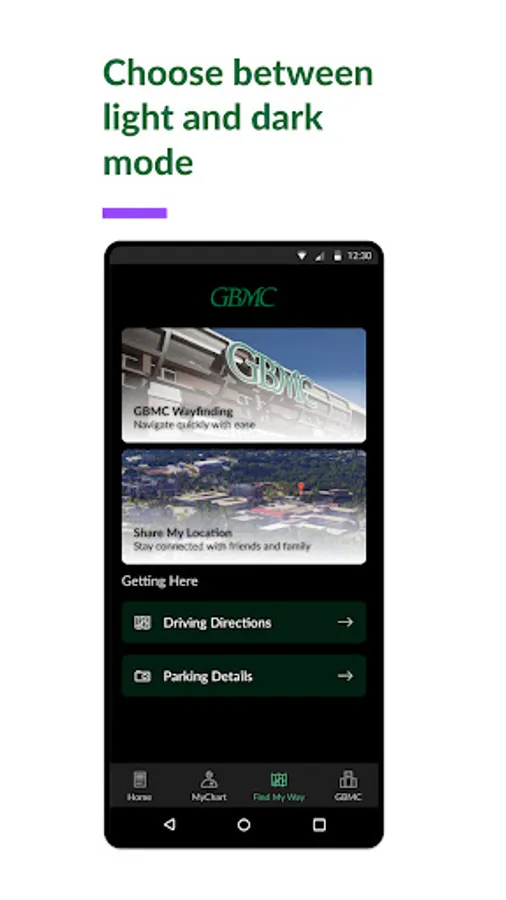 The GBMC HealthCare app is designed to help patients and their loved ones navigate our healthcare system with ease. It includes GPS wayfinding, directing you from home to the proper parking garage on GBMC's campus. Once you arrive, the app offers step-by-step directions to help you find your exact appointment location.
