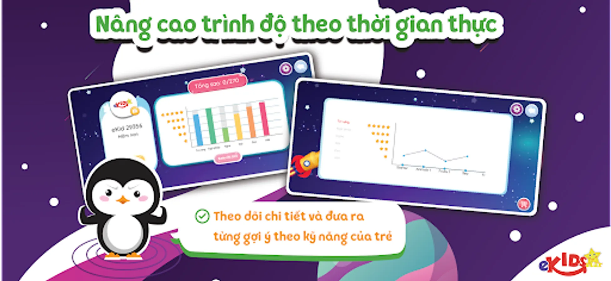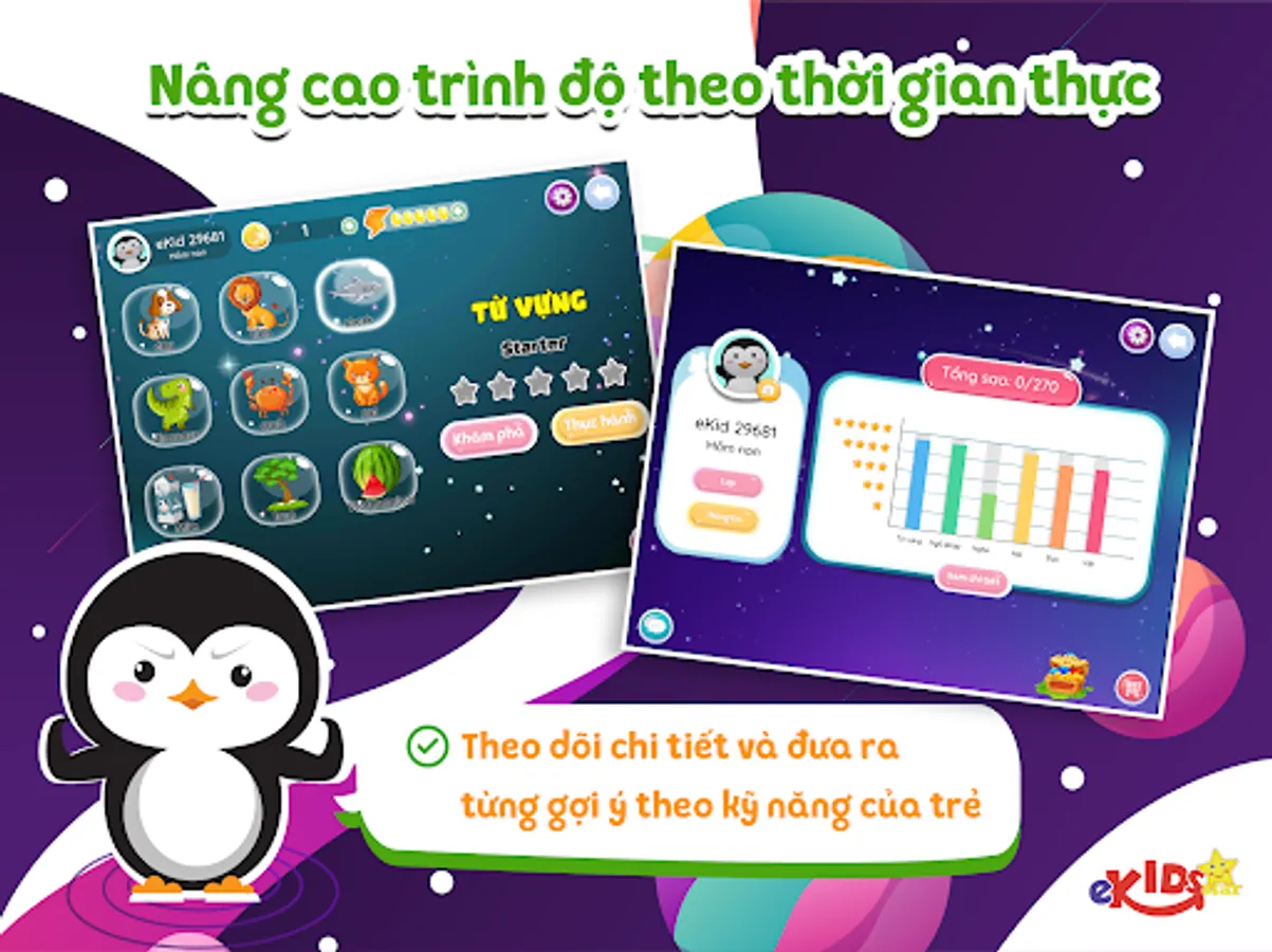 EKids Star is the only application that can help parents and students track in real time the progress of each student's learning. eKids provides a detailed statistics system for each skill as well as suggestions for students' areas for improvement.