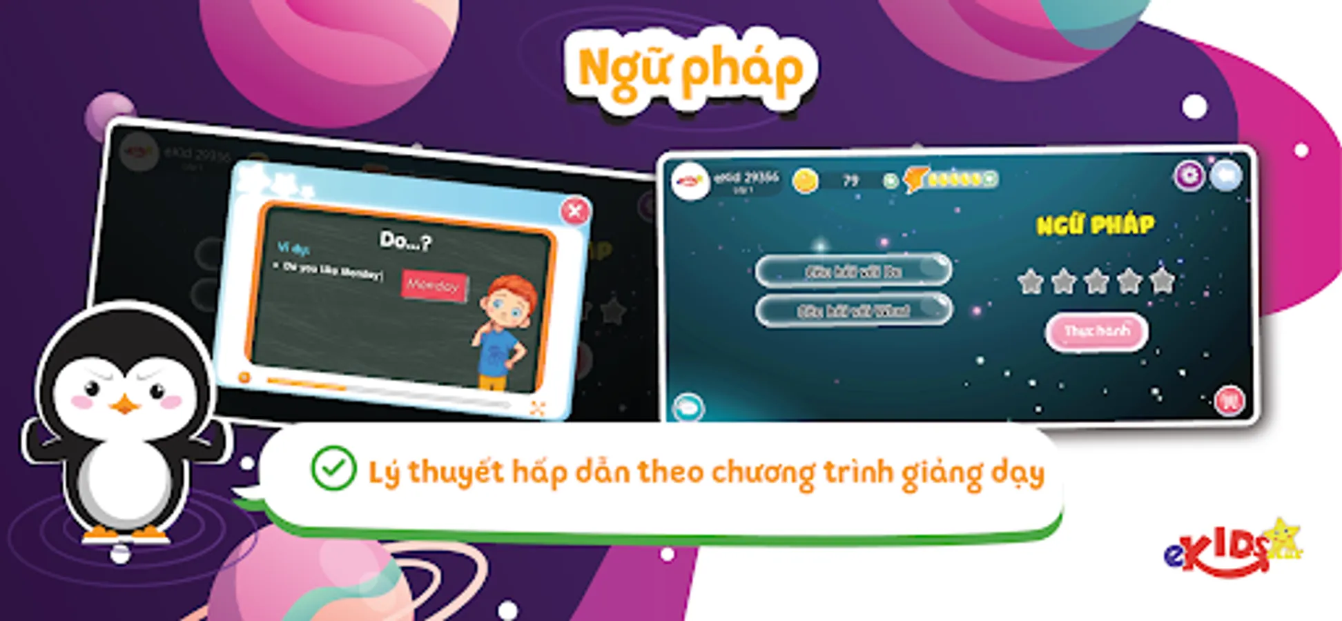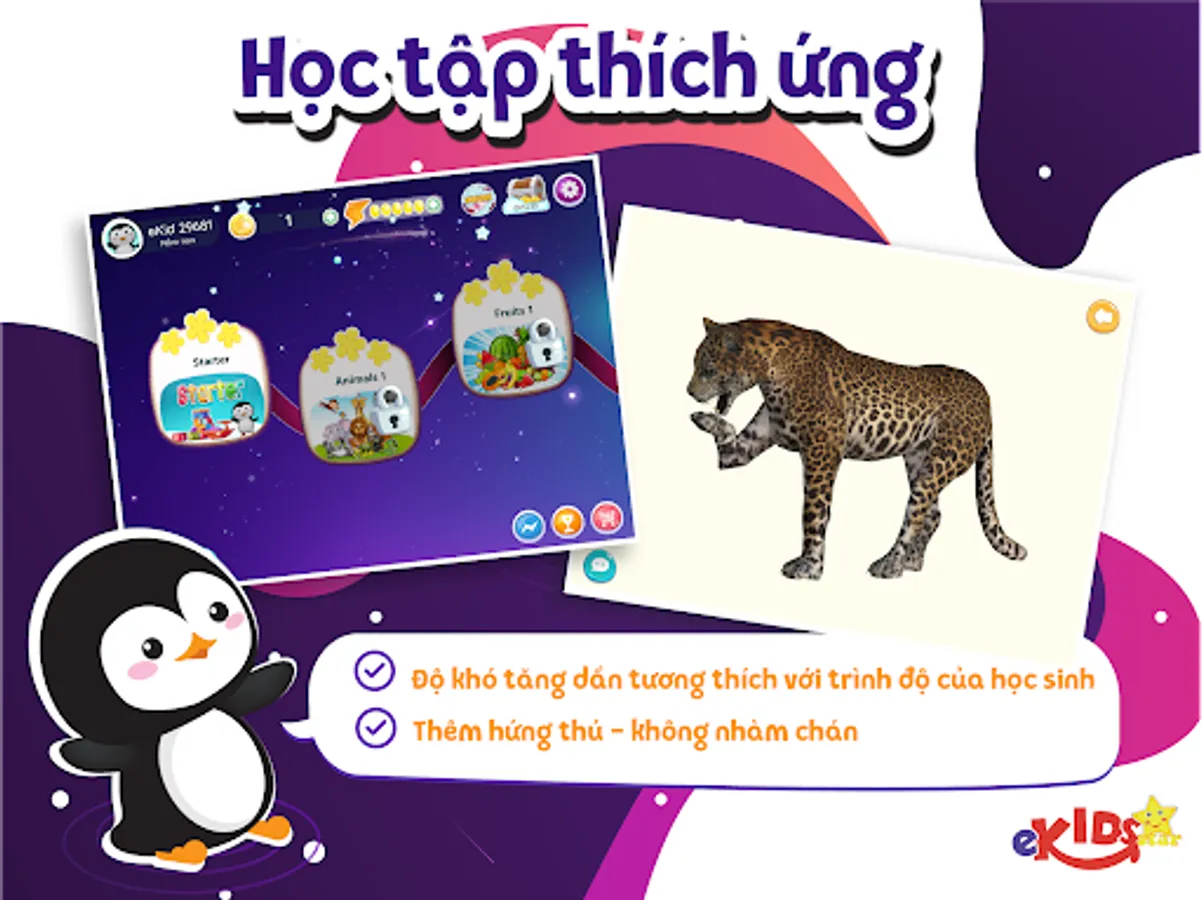 Never before has learning been so engaging, theory and practice are clearly separated in eKids Star. Besides hundreds of lectures in the form of 2D, 3D songs, theory in both Vietnamese and English makes it easier than ever for parents and students to understand. eKids Star also offers over 500 games and 100,000+ questions divided into easy, medium and hard levels. Moreover, the application of artificial intelligence helps to optimize the effectiveness of adaptive learning in eKids; help students gradually progress and bring more joy in learning.